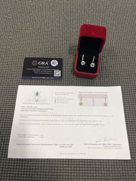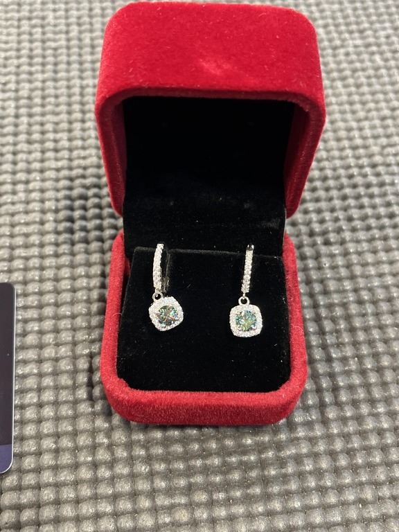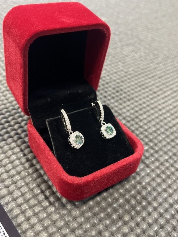 1.00 CT TW GRA CERTIFIED ROUND BRILLIANT CUT MOISSANITE STONES VVS VIVID BLUISH GREEN COLOR WITH 50 ROUND BRILLIANT CUT CUBIC ZIRCONIA SET IN SQUARE HALOS AND IN HOOPS SET IN 925 SILVER EARRINGS RETAIL VALUE $1,220.00