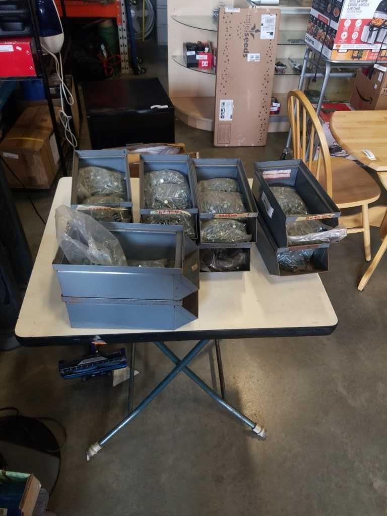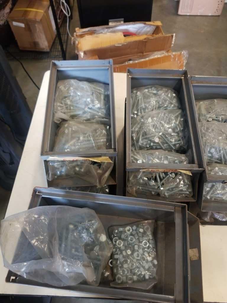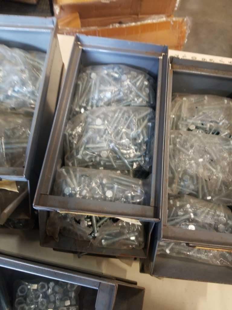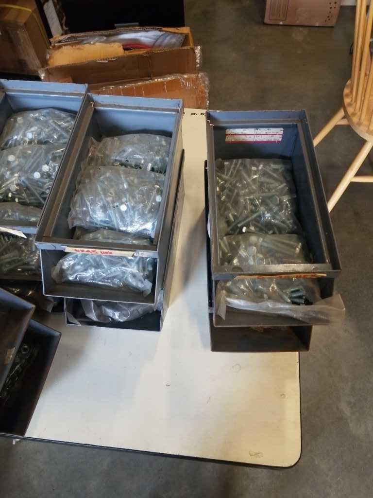 10 METAL PARTS BINS OF 6 AND 8 BOLTS AND NUTS