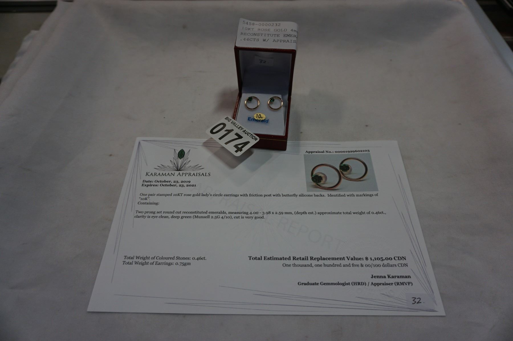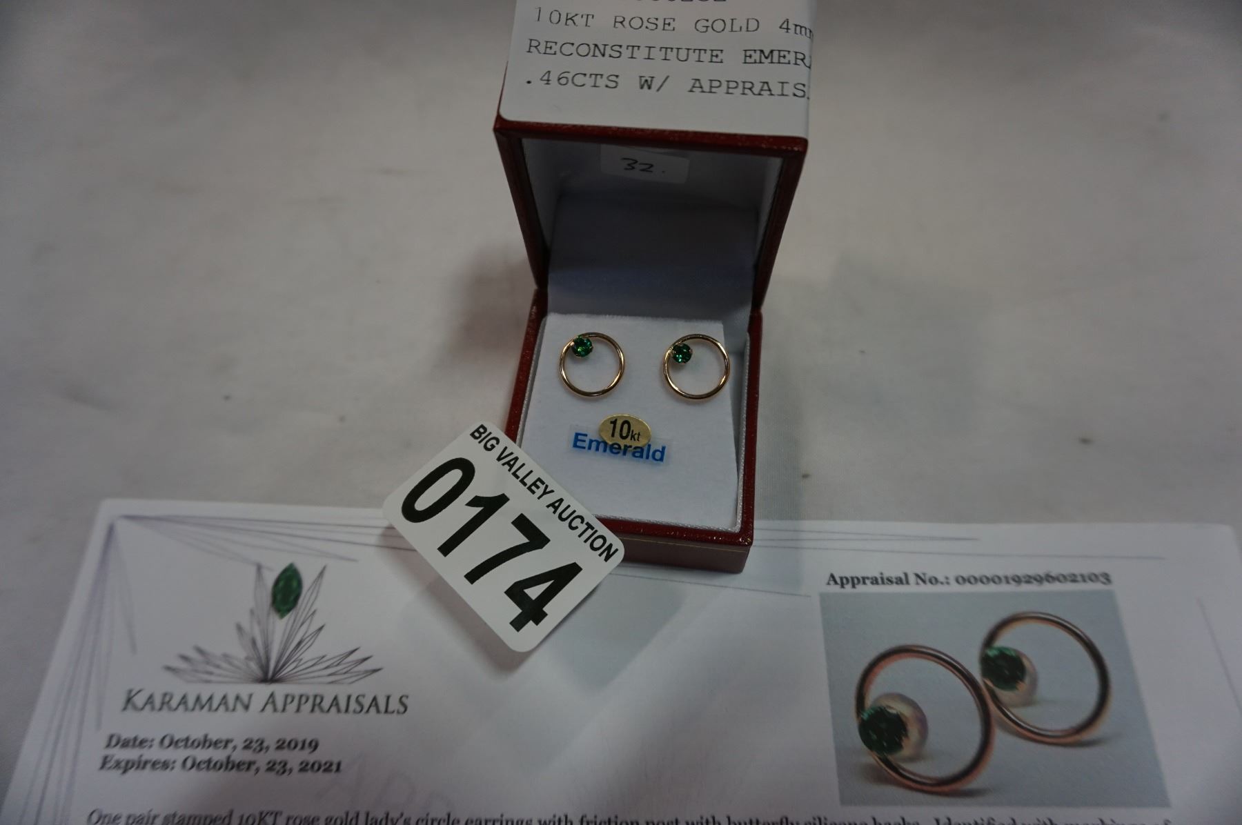 10KT ROSE GOLD 4mm RECONSTITUTE EMERALD EARRINGS .46CTS W/ APPRAISAL $1105