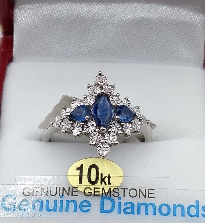 10KT WHITE GOLD GENUINE BLUE SAPPHIRE AND DIAMOND RING W/ APPRAISAL $1480 - SIZE 6.75, 0.6CT SAPPHIR