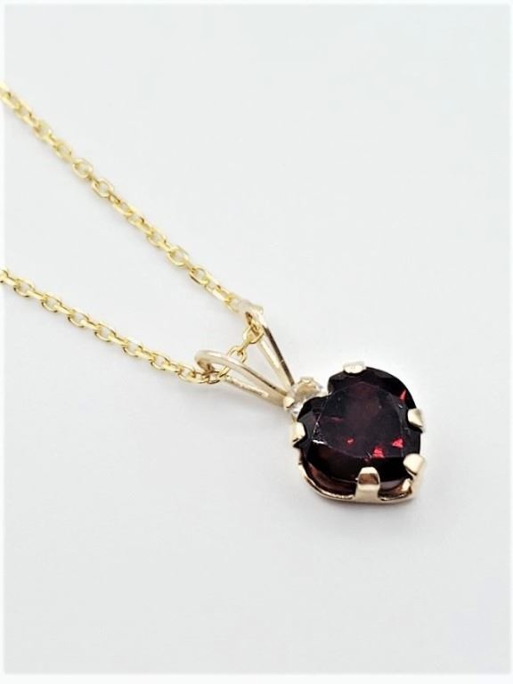 10KT. YELLOW GOLD 5.75MM X 5.8MM NATURAL GARNET (0.70CTS) & MOONSTONE HEART PENDANT WITH STERLING CHAIN, W/A $700.00