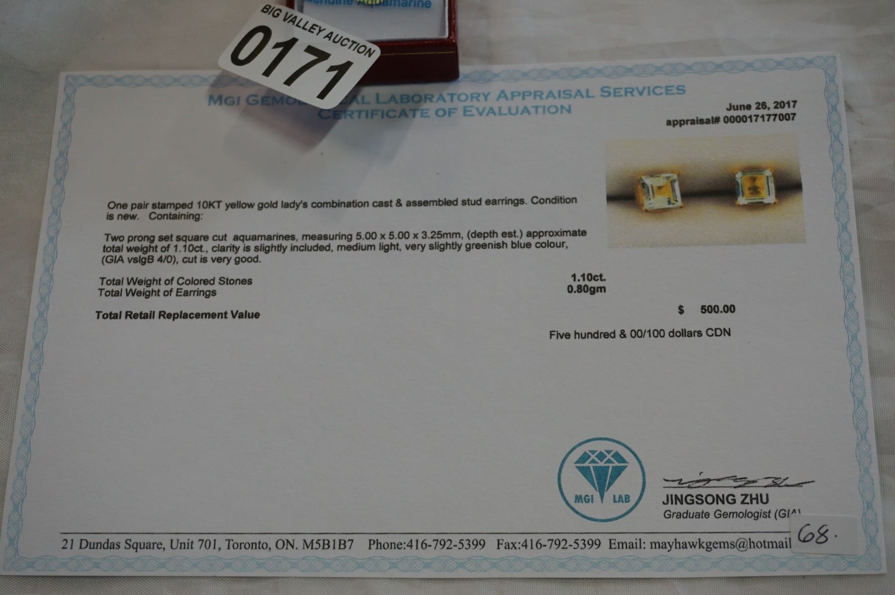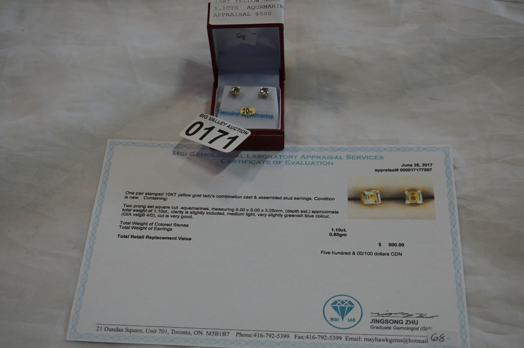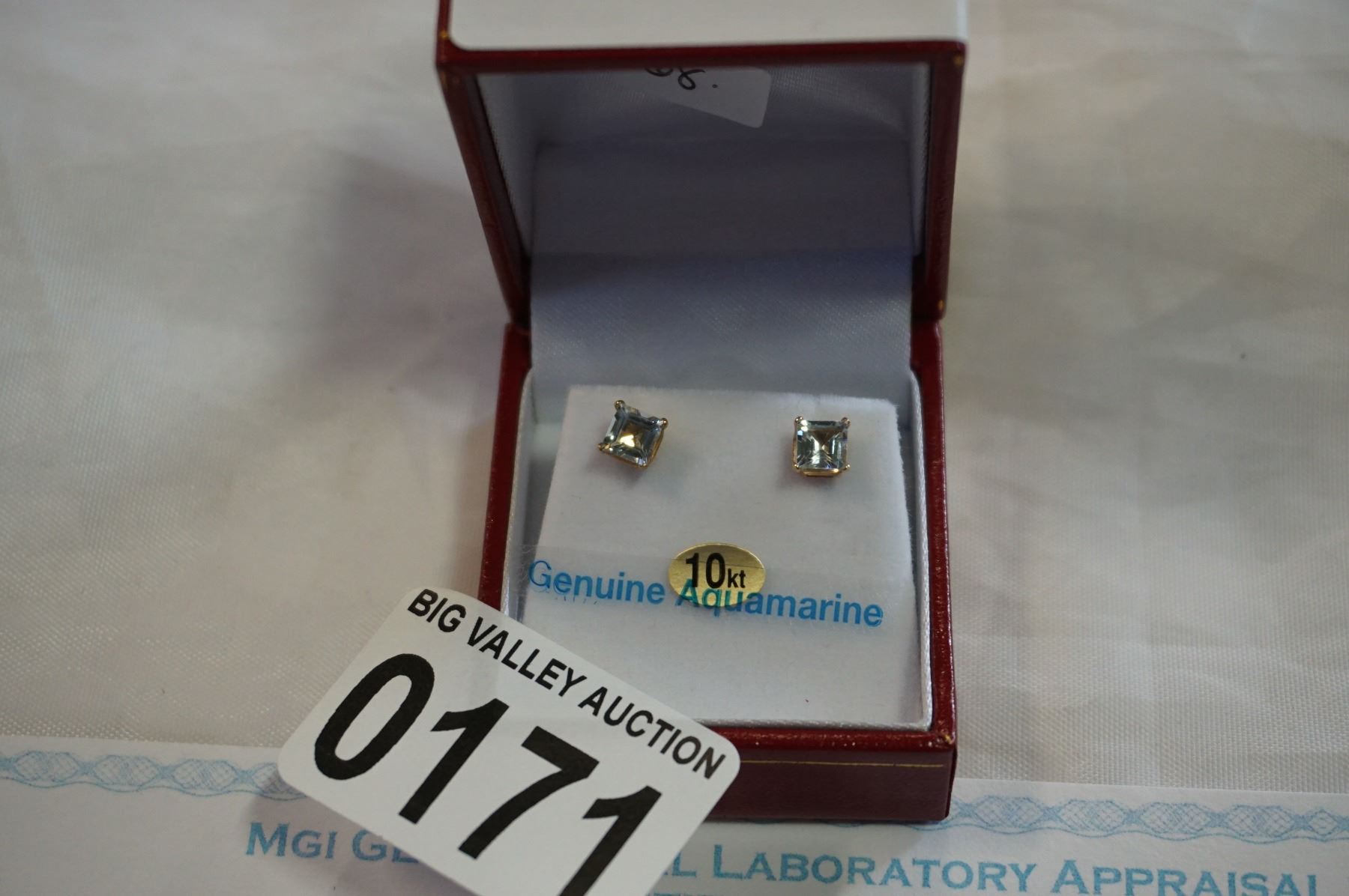 10KT YELLOW GOLD 5x5mm GENUINE 1.1CTS AQUAMARINE EARRINGS W/ APPRAISAL $500