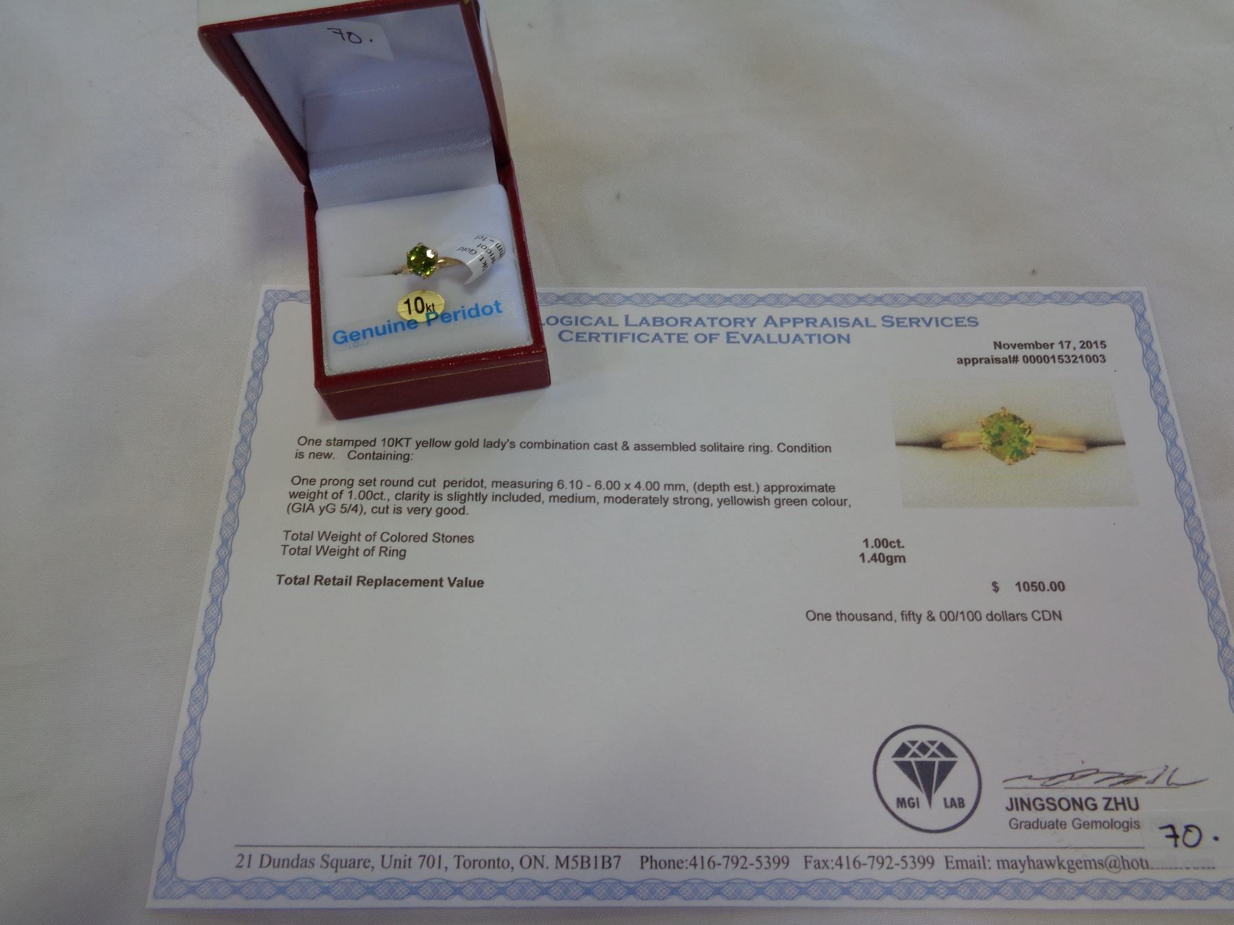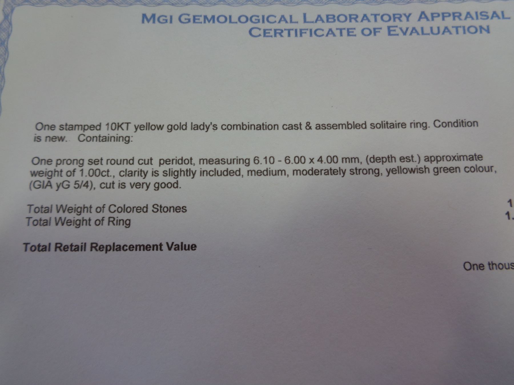 10KT YELLOW GOLD 6MM GENUINE 1CT PERIDOT SOLITAIRE RING SIZE 4.5 W/ APPRAISAL $1050
