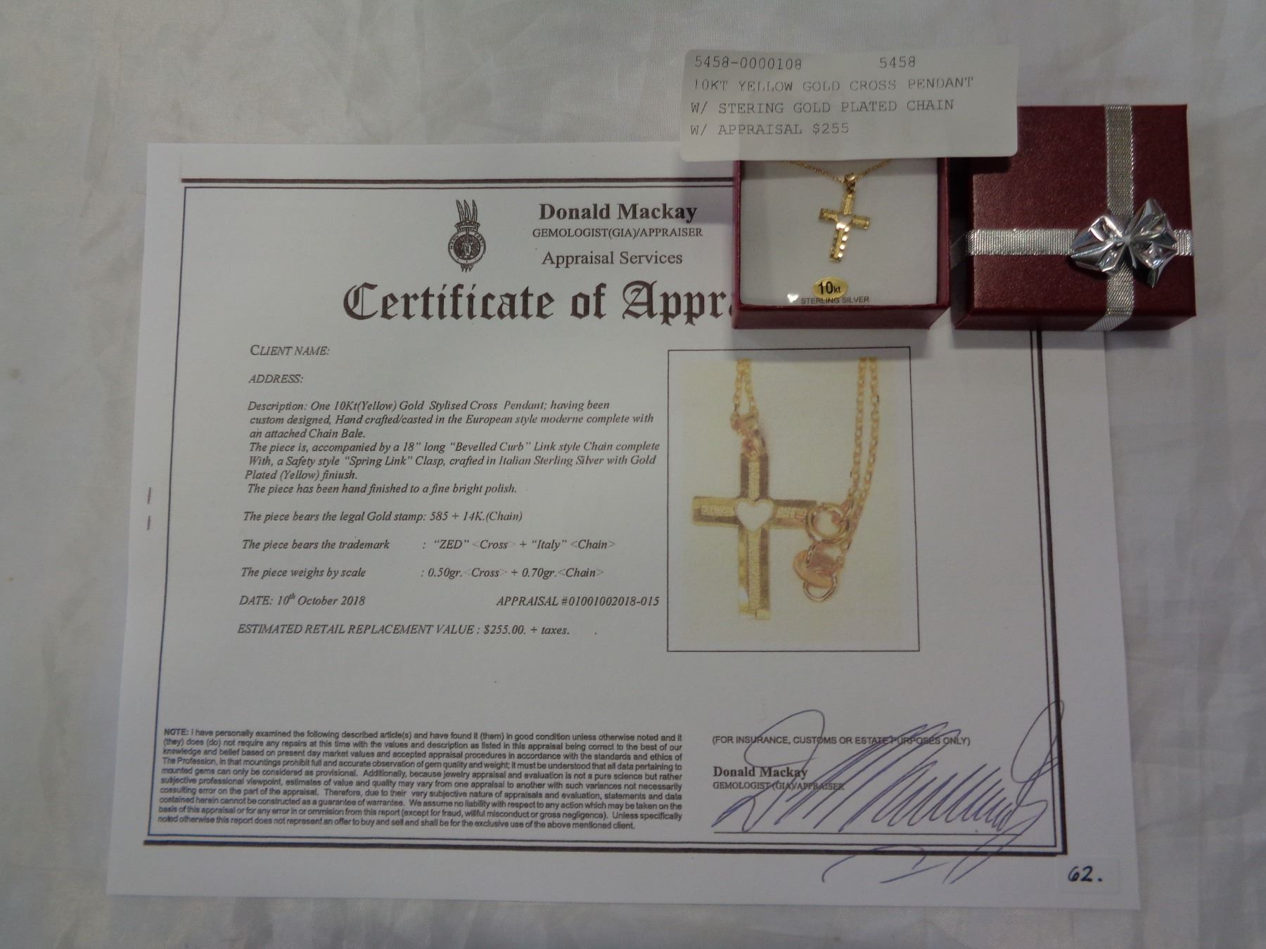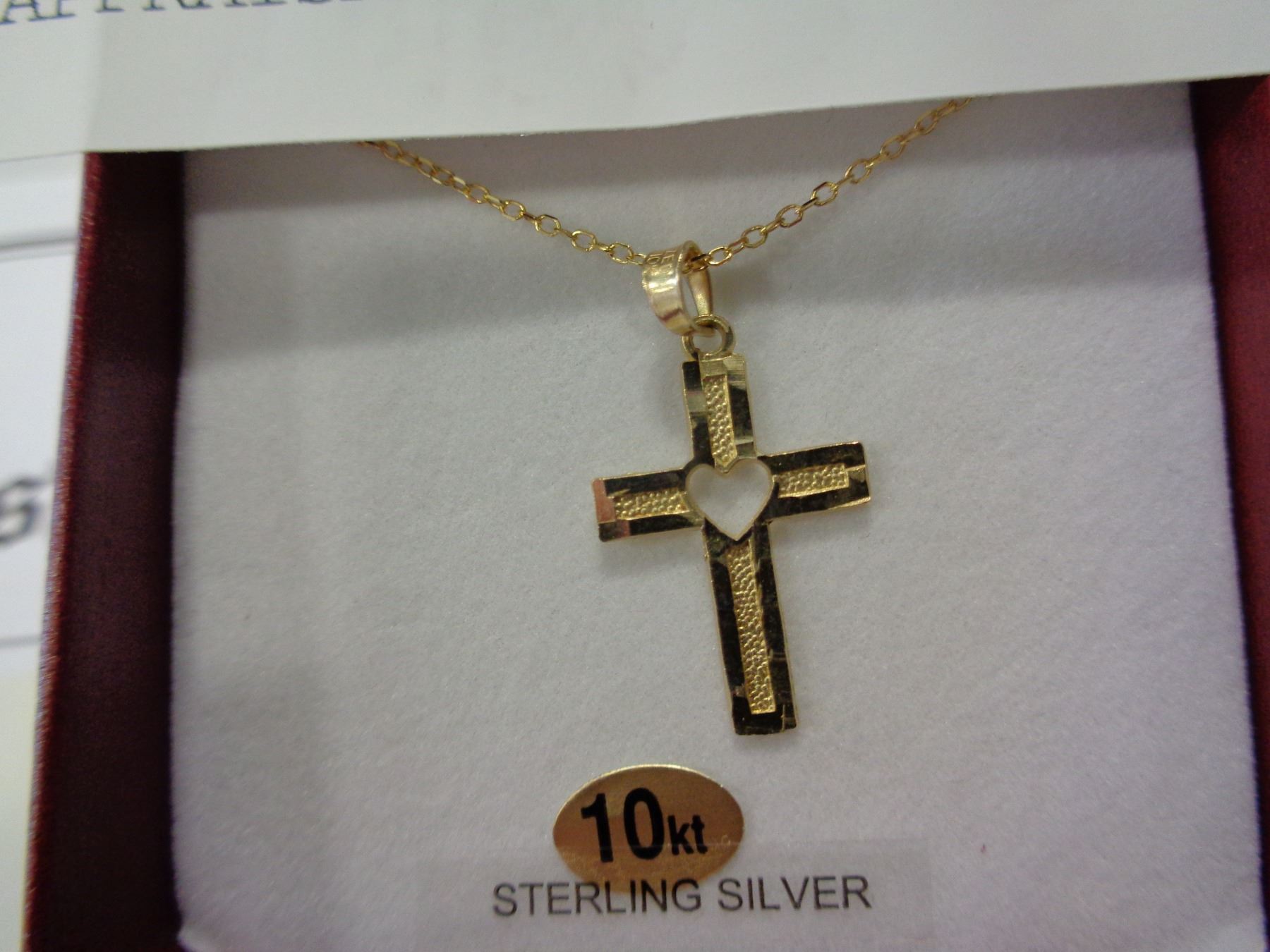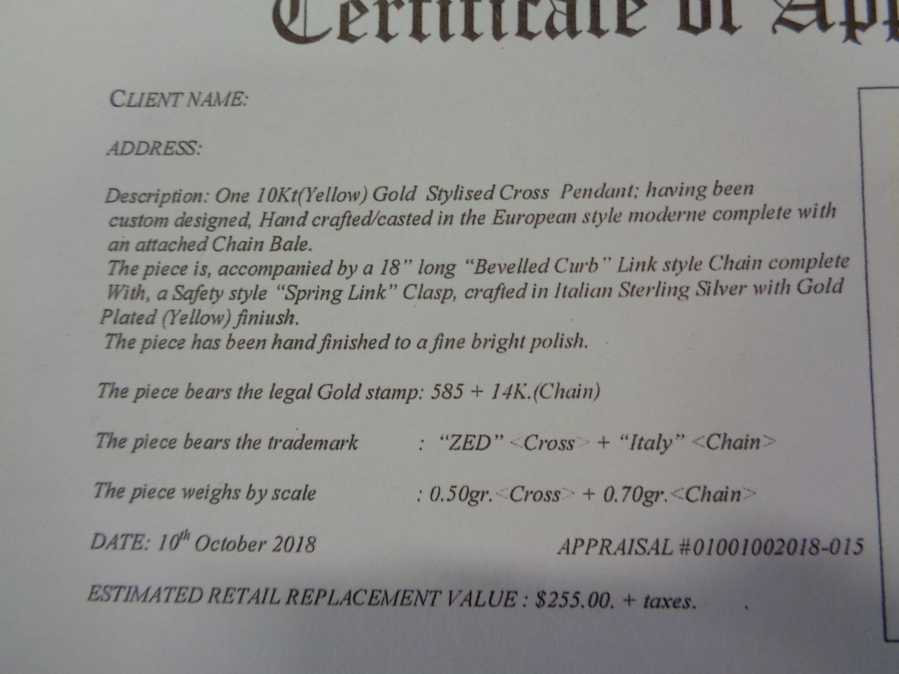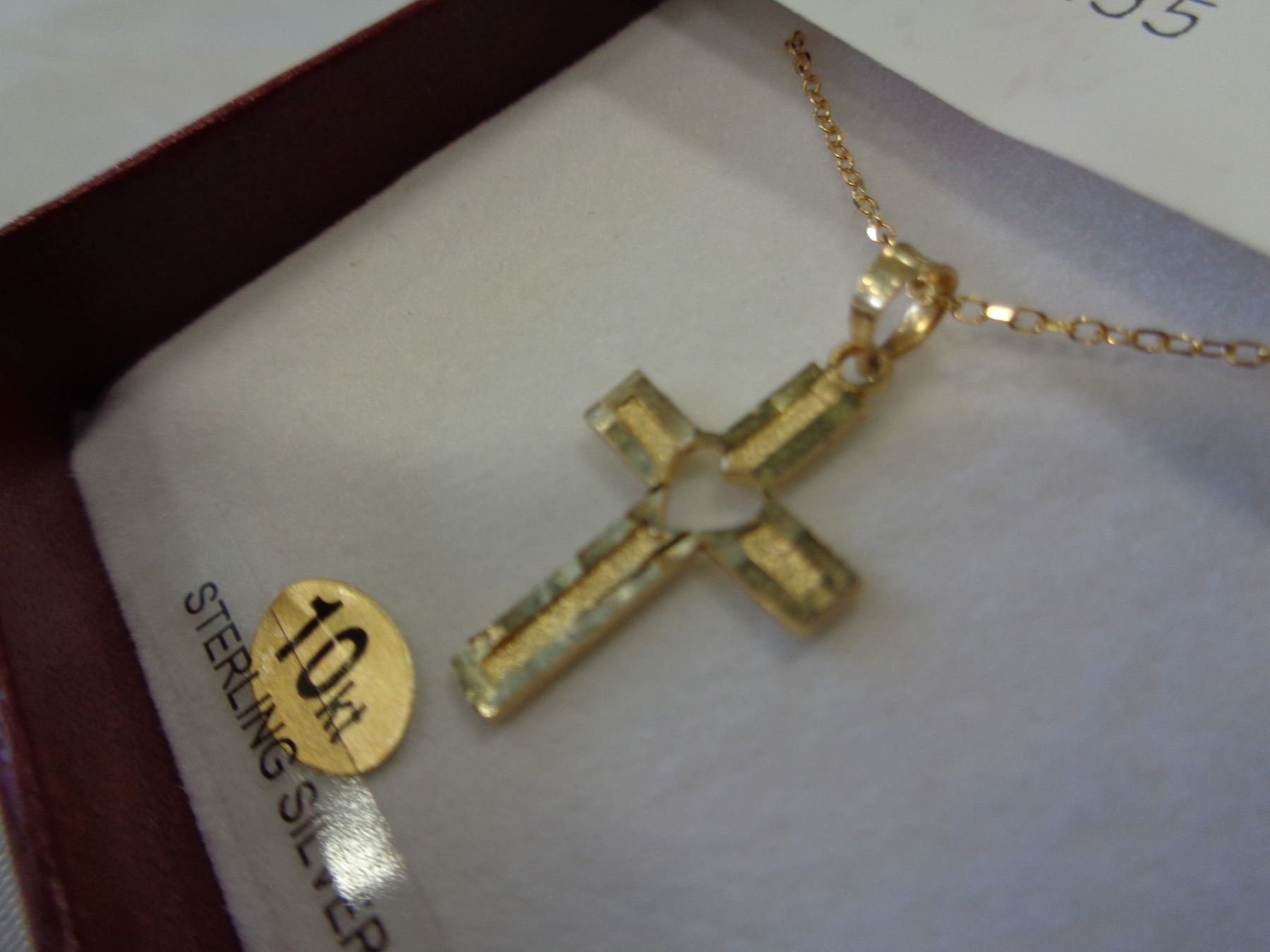 10KT YELLOW GOLD CROSS PENDANT W/ STERING GOLD PLATED CHAIN W/ APPRAISAL $255