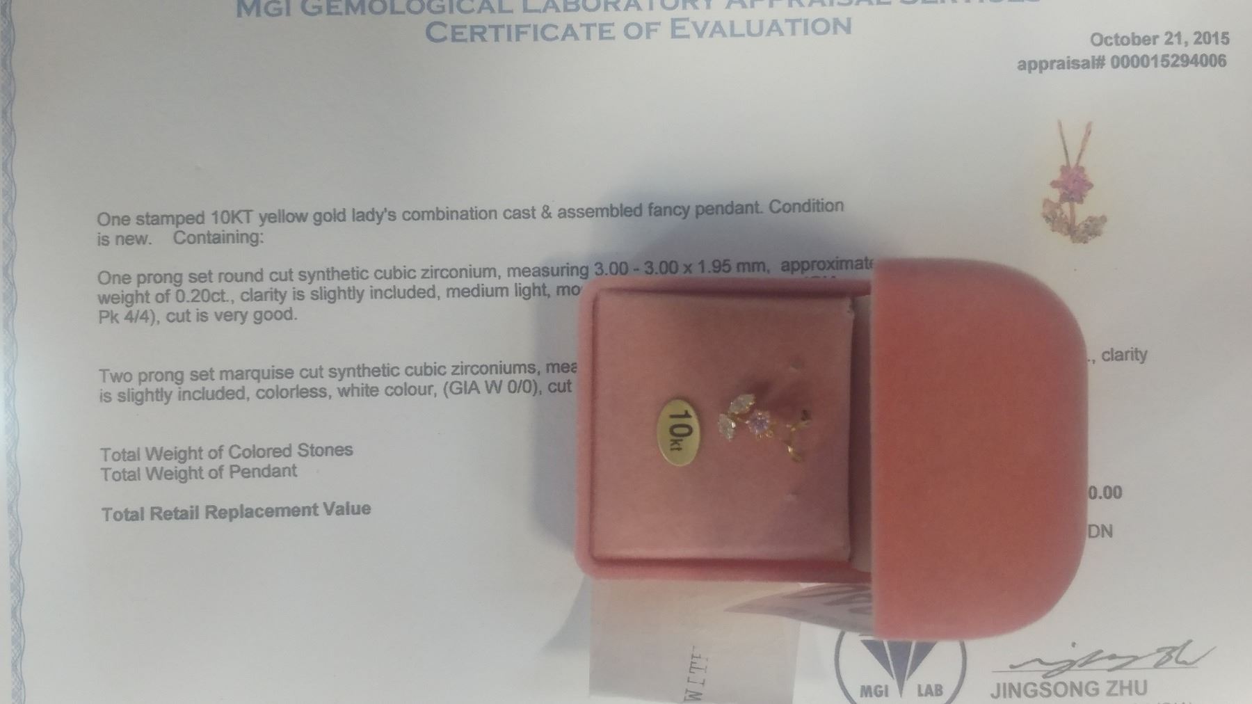10KT YELLOW GOLD CUBIC ZIRCONIA FLORAL PENDANT WITH APPRAISEL $450.00