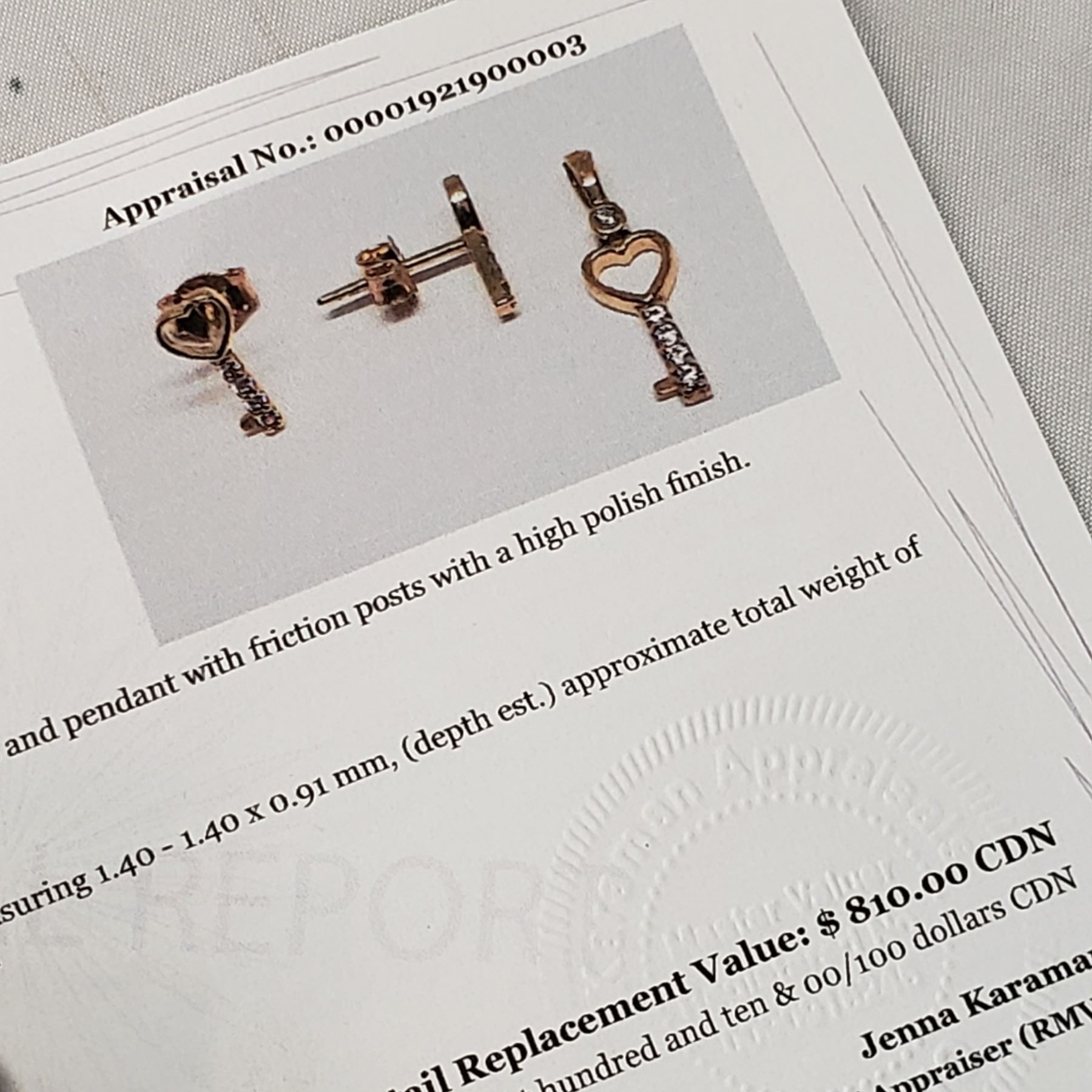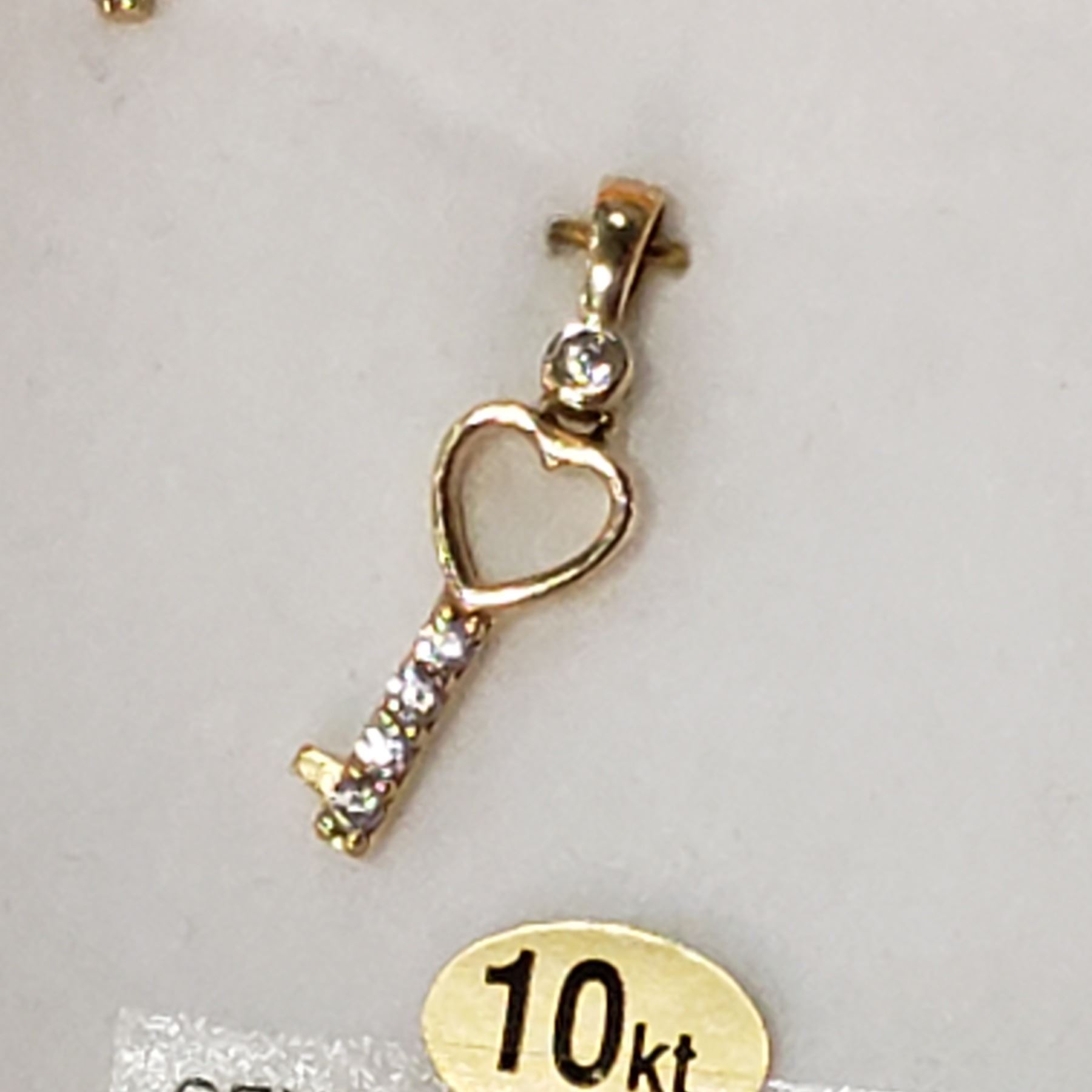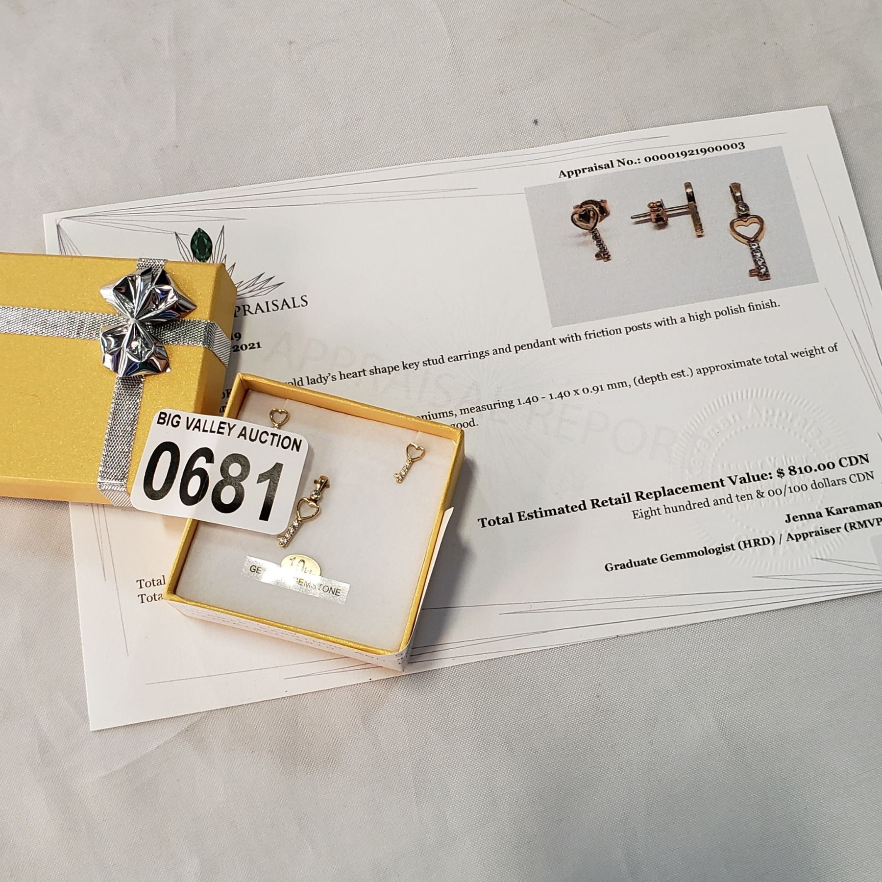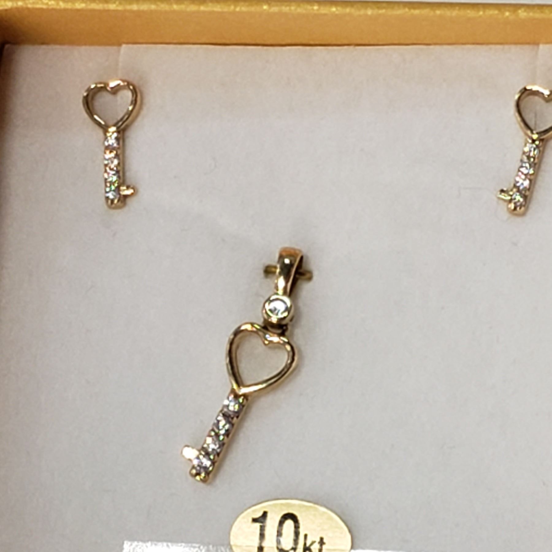 10KT YELLOW GOLD CZ "KEY TO MY HEART" EARRINGS AND PENDANT W/ APPRAISAL $810