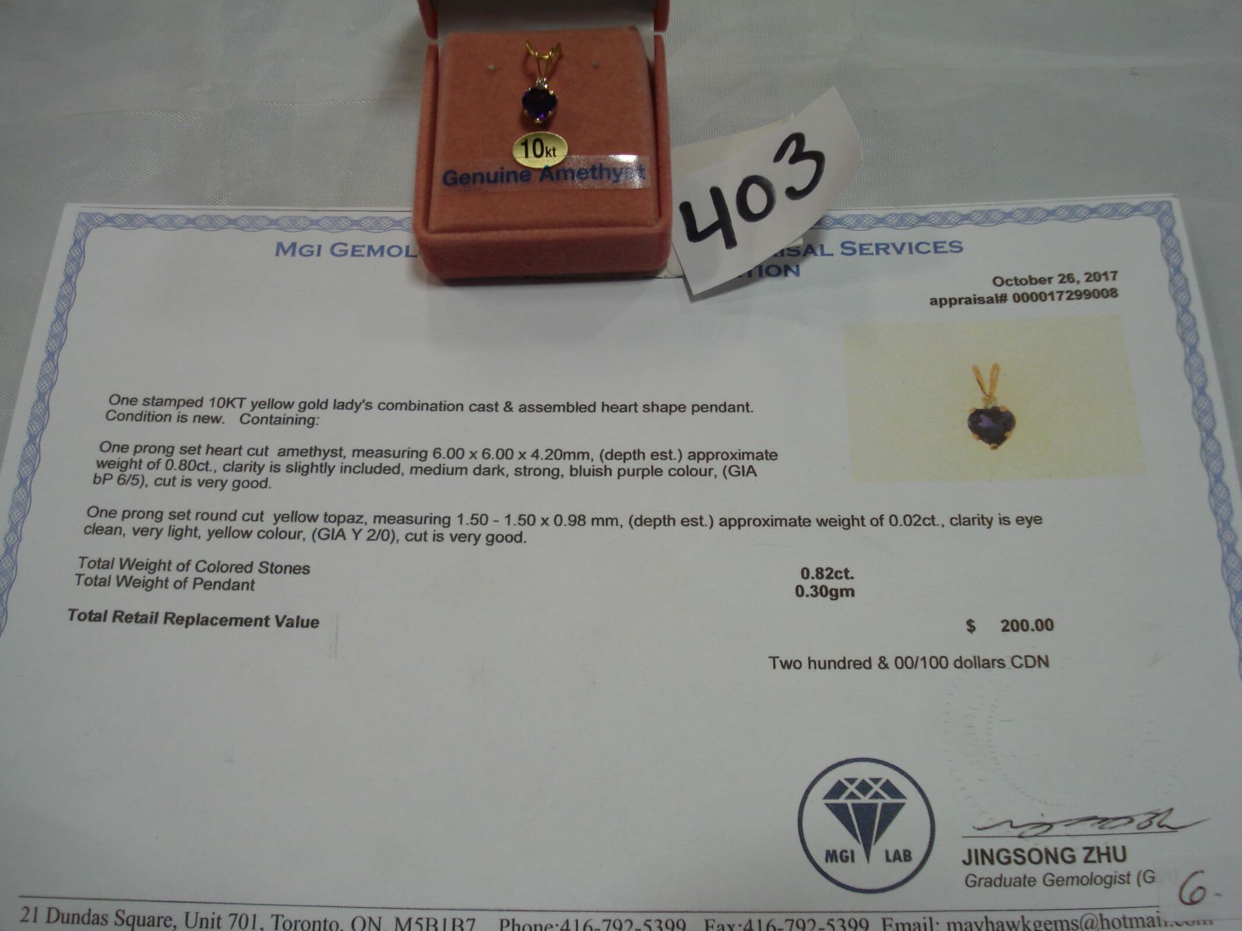 10KT YELLOW GOLD GENUINE AMETHYST AND TOPAZ HEART PENDANT WITH APPRAISAL $200.00