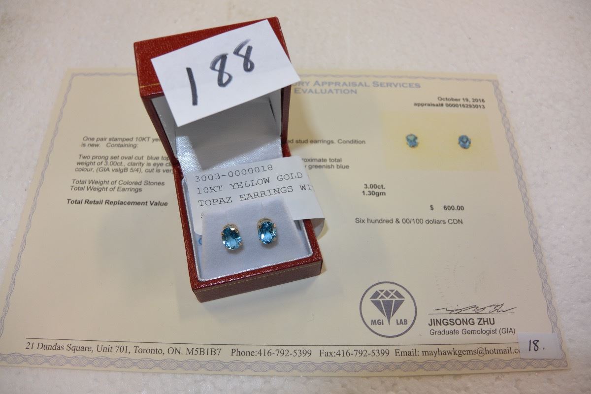 10KT YELLOW GOLD GENUINE BLUE TOPAZ EARRINGS WITH APPRAISAL