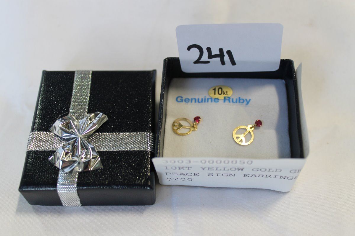 10KT YELLOW GOLD GENUINE RUBY PEACE SIGN EARRINGS RETAIL