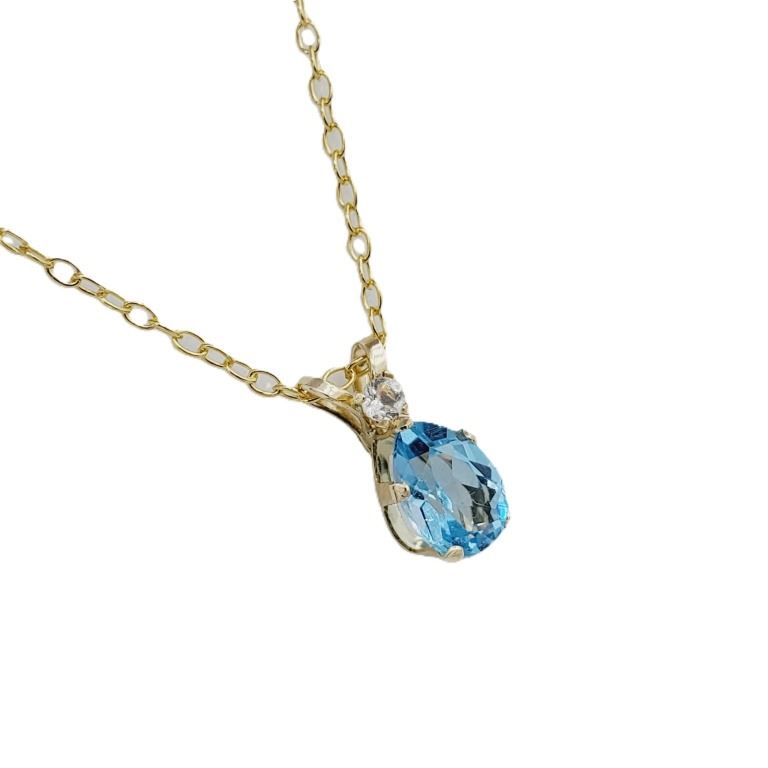 10KT YELLOW GOLD NATURAL BLUE TOPAZ (0.83CT) PEAR SHAPE PENDANT WITH GOLD PLATED STERLING SILVER CHAIN, RETAIL $400.00.