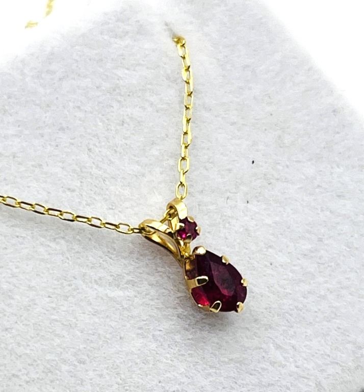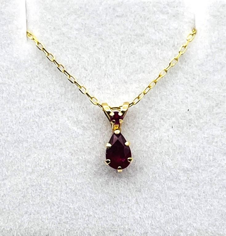 10KT YELLOW GOLD NATURAL ENHANCED RUBY (0.93CT) PENDANT WITH GOLD PLATED STERLING SILVER CHAIN, RETAIL $400.00.