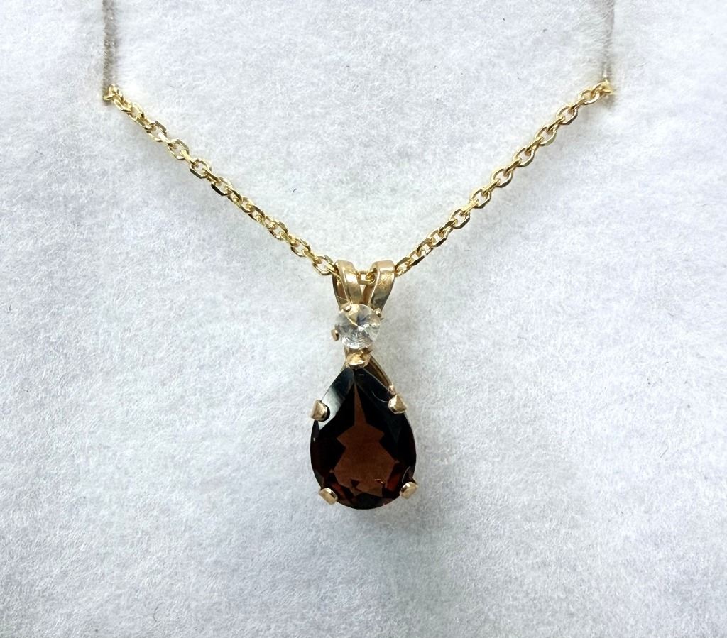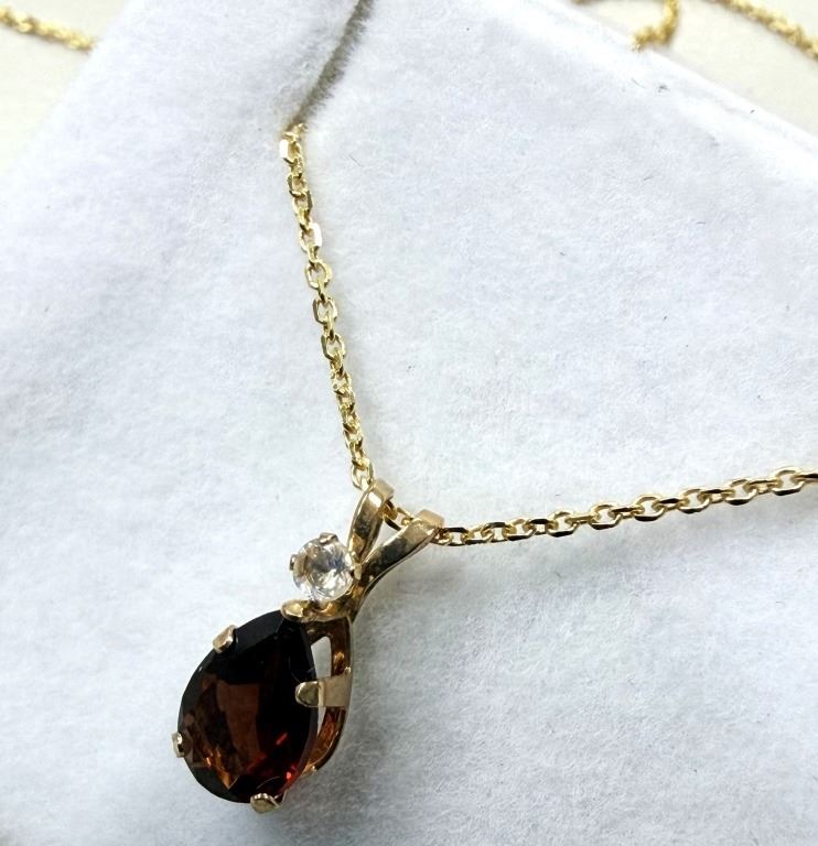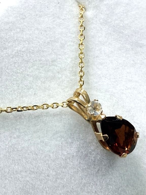 10KT YELLOW GOLD NATURAL GARNET PENDANT WITH GOLD PLATED STERLING SILVER CHAIN, RETAIL $400.00. GARNET IS THE BIRTHSTONE FOR JANUARY.