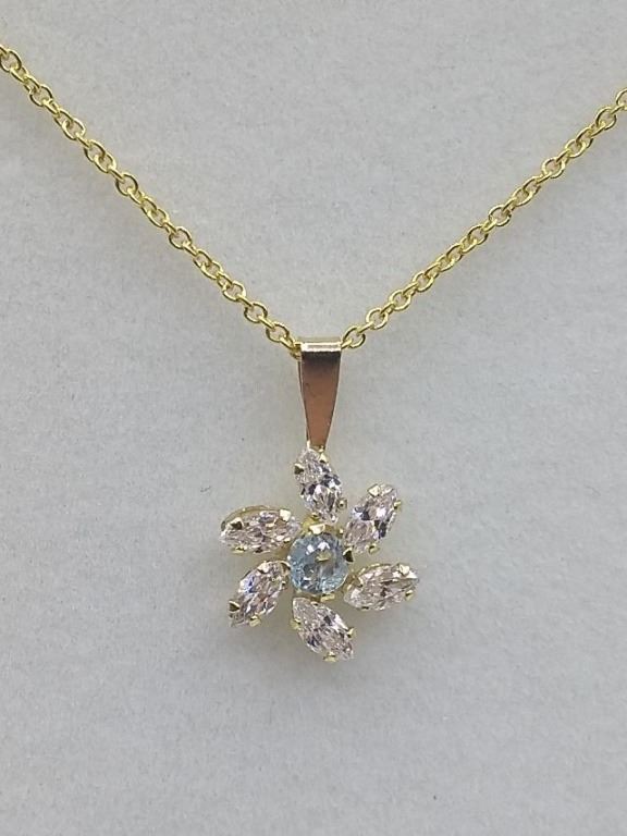 10KT YELLOW PENDANT W/ STERLING SILVER GOLD PLATED CHAIN SET W/ AQUAMARINE GEMSTONE AND CZ W/ APPRAISAL $900
