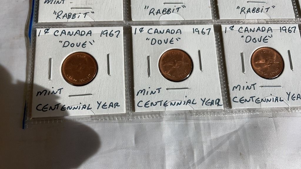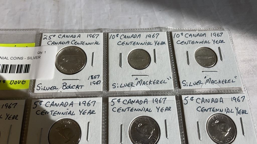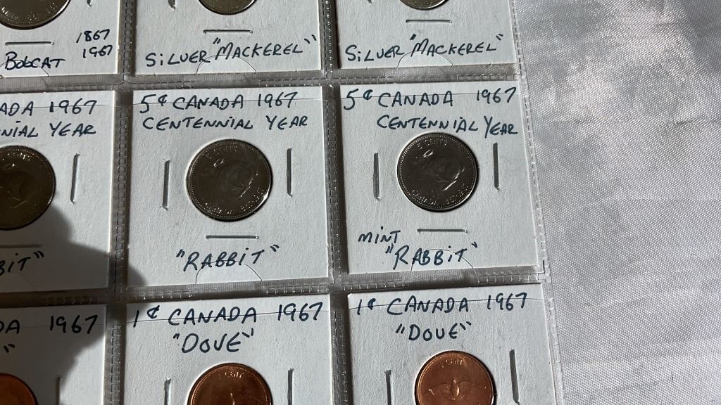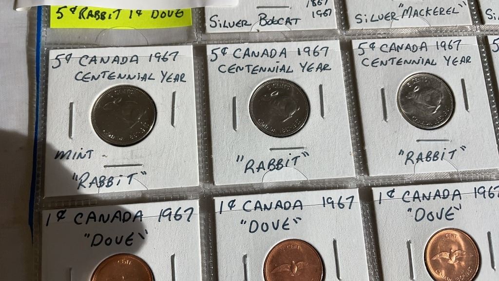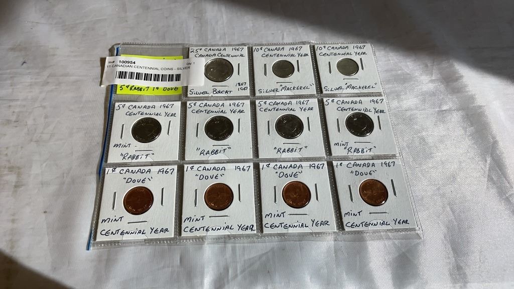 11 CANADIAN CENTENNIAL COINS - SILVER QUARTERS AND DIMES, PLUS RABBIT NICKEL AND DOVE PENNY