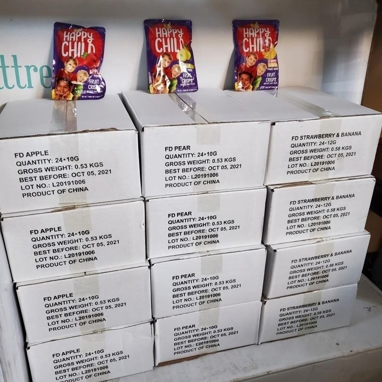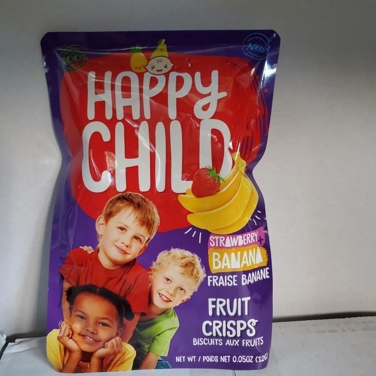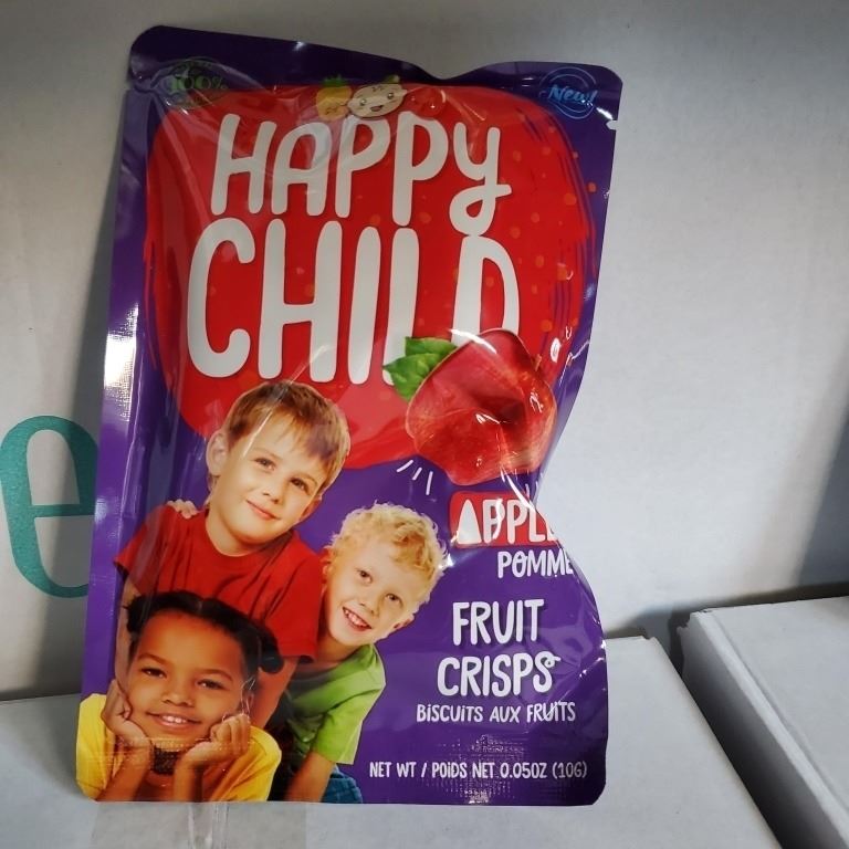 12 NEW CASES OF HAPPY CHILD FRUIT CRISPS - 4 CASES OF EACH FLAVOR APPLE, PEAR, STRAWBERRY BANANA, 24 PACKS PER CASE