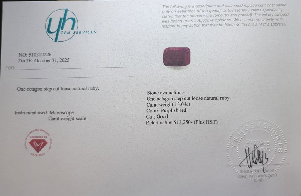 13.04 CT CERTIFIED RUBY GEMSTONE ($12,250 APPRAISAL)