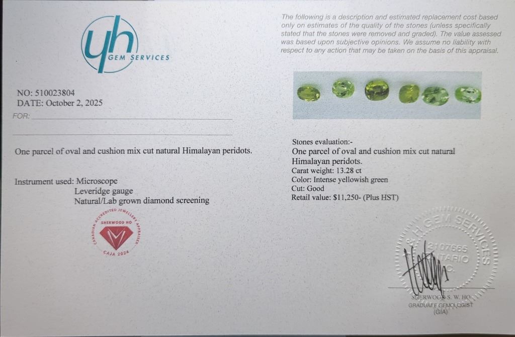 13.28 CT CERTIFIED HIMALAYAN PERIDOT GEMSTONE PARCEL ($11,250 APPRAISAL)