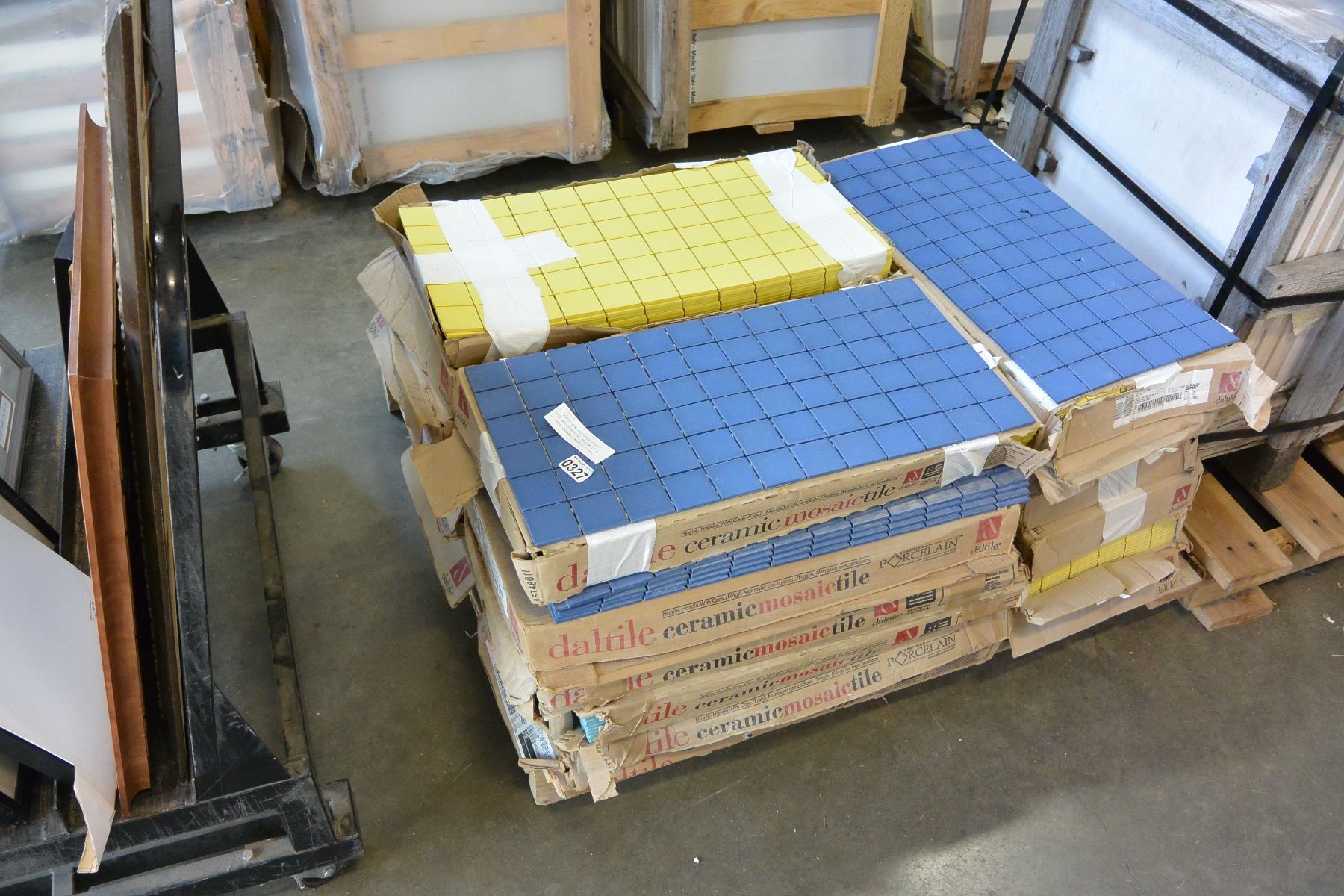 14 BOXES NEW ASSORTED COBALT BLUE AND SUNSHINE YELLOW 12 X 24 INCH CERAMIC MOSAIC TILES, 24 SQFT BOX