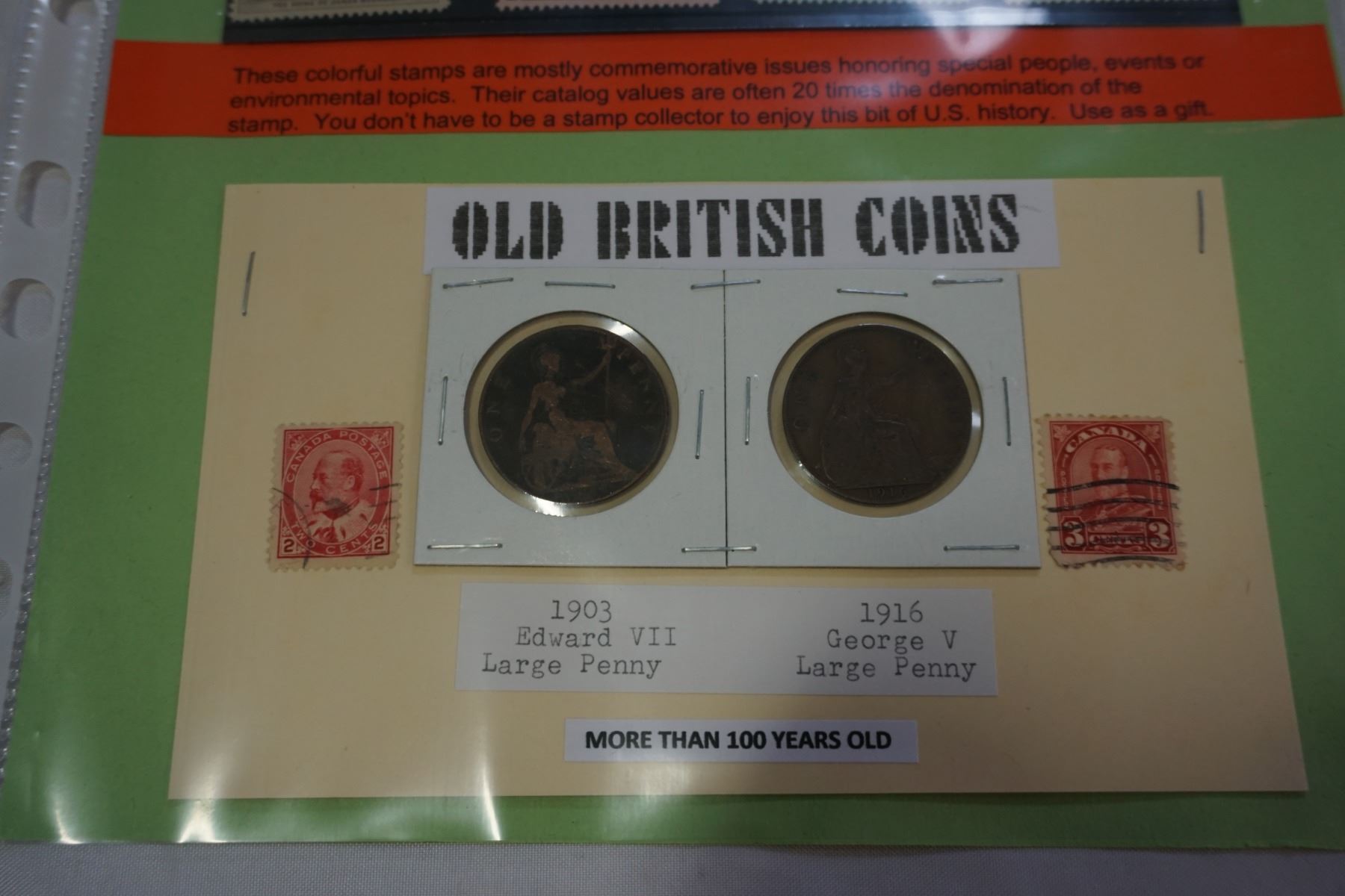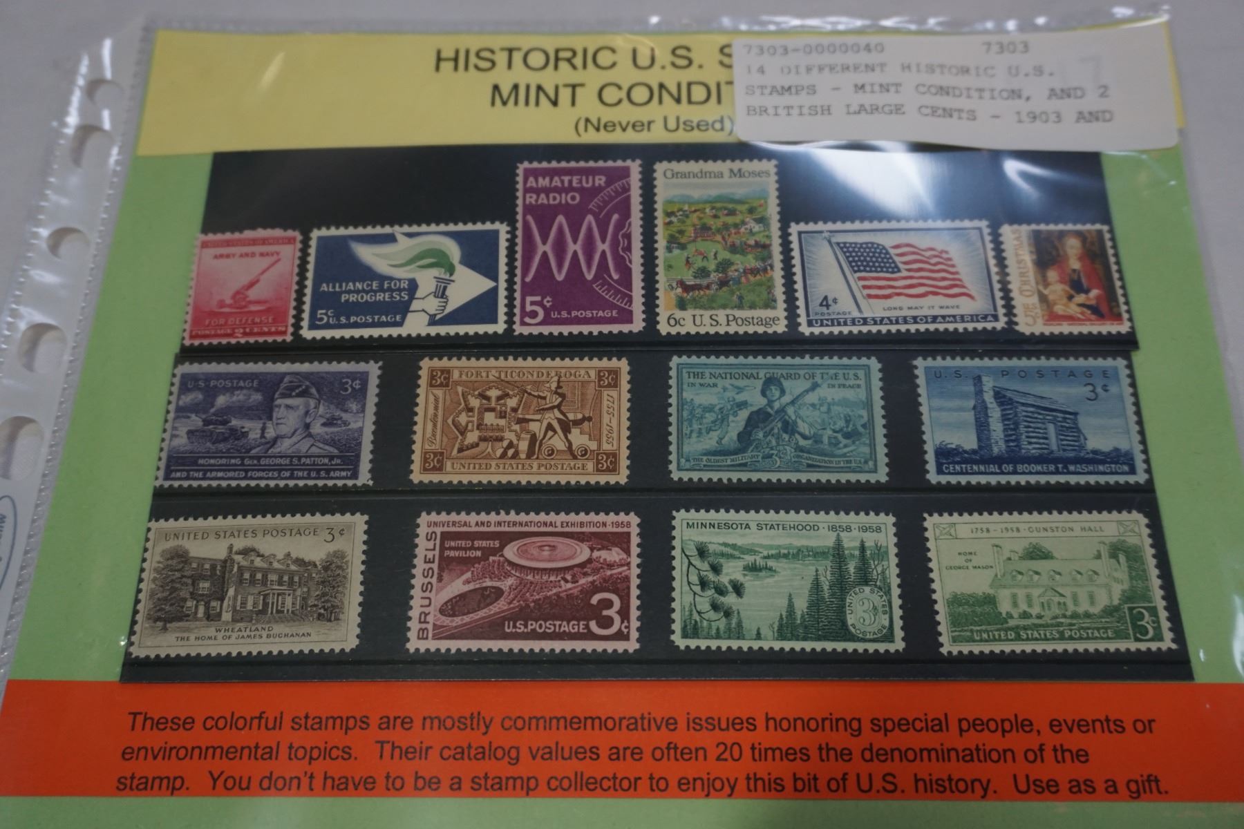 14 DIFFERENT HISTORIC U.S. STAMPS - MINT CONDITION, AND 2 BRITISH LARGE CENTS - 1903 AND 1916