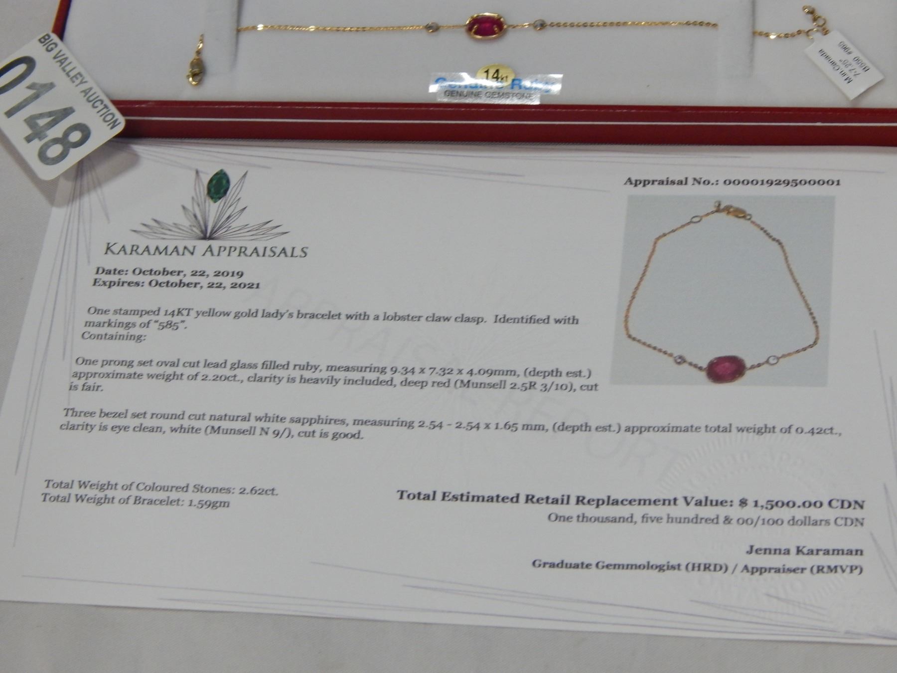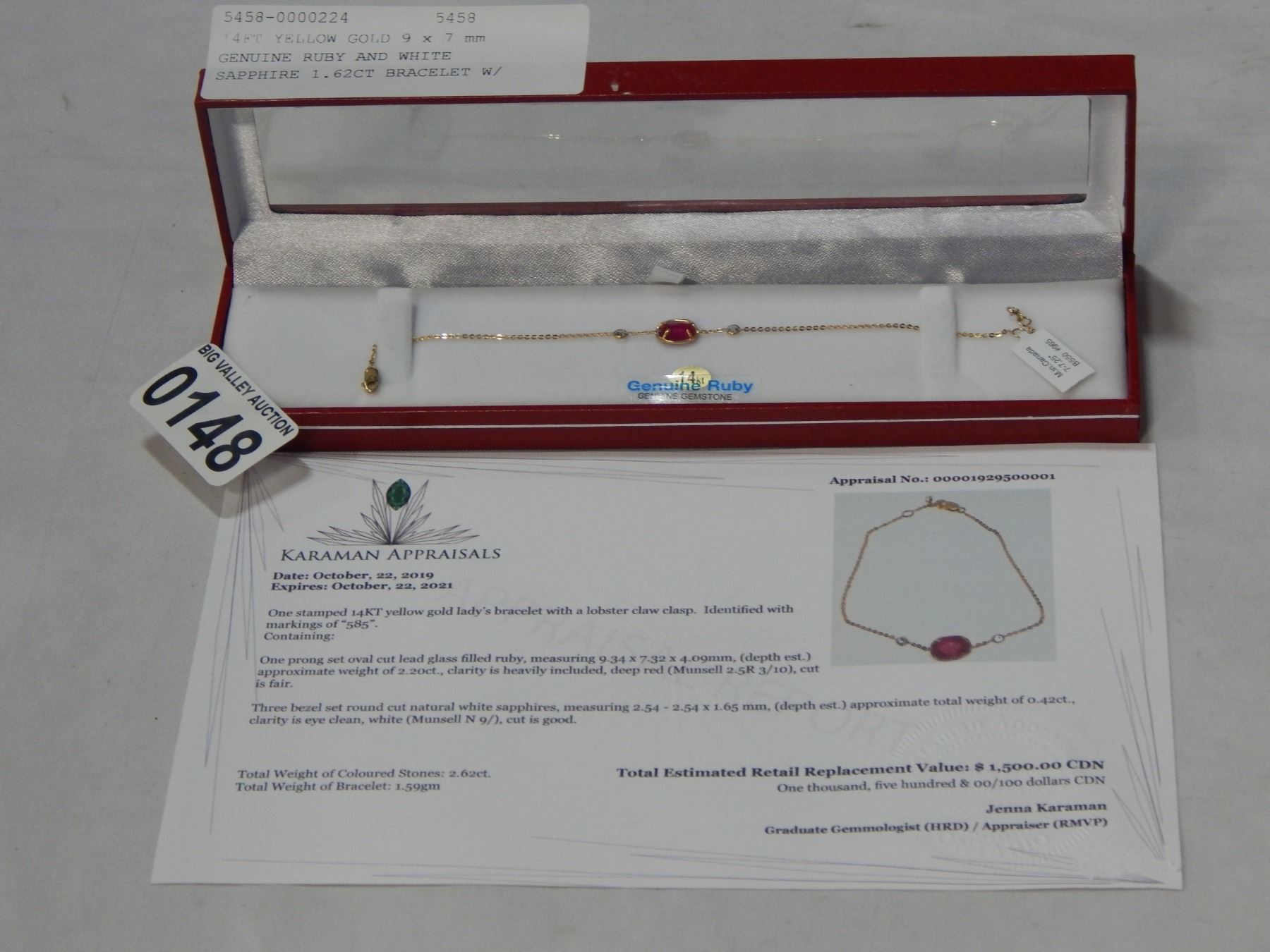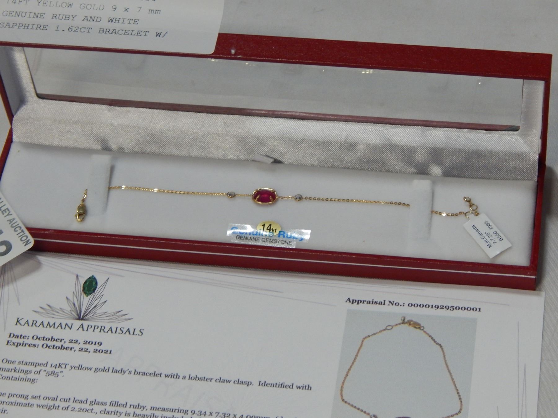 14FT YELLOW GOLD 9 x 7 mm GENUINE RUBY AND WHITE SAPPHIRE 1.62CT BRACELET W/ APPRAISAL $1500
