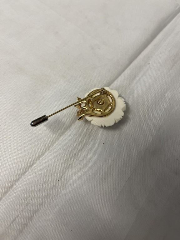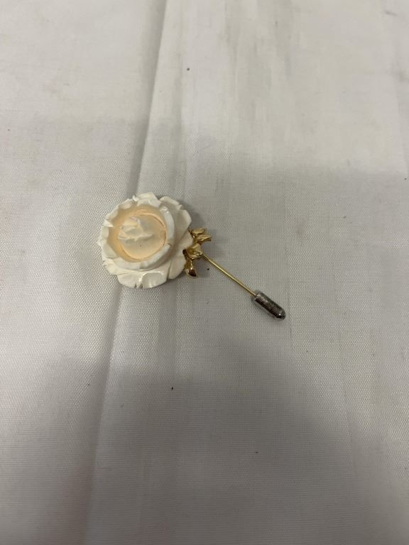 14K GOLD GUILDED HINGED STICKPIN W/ HAND CARVED IVORY ROSE