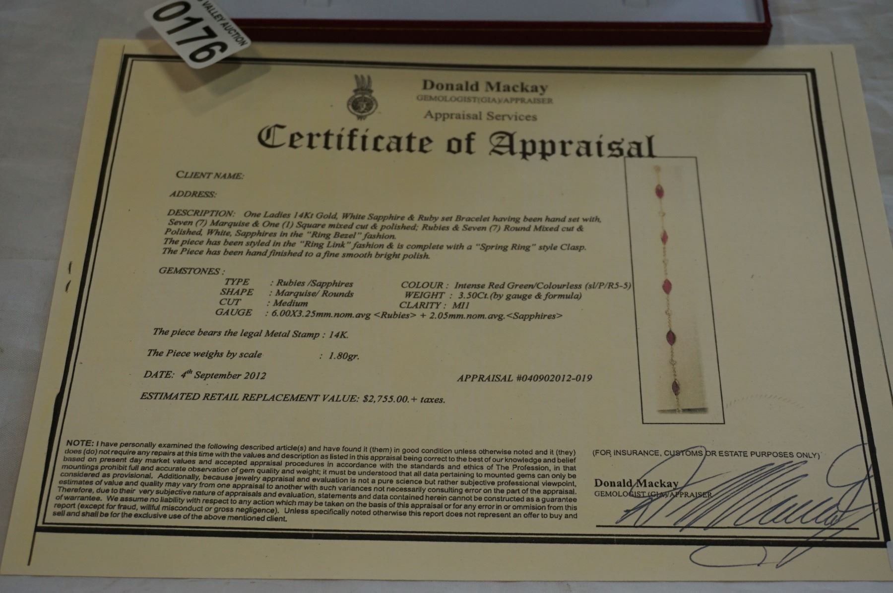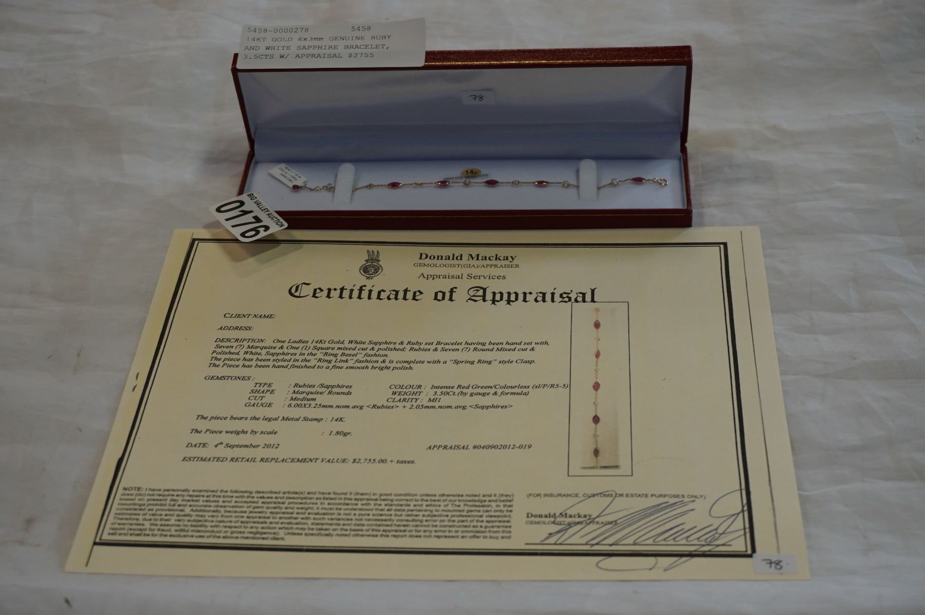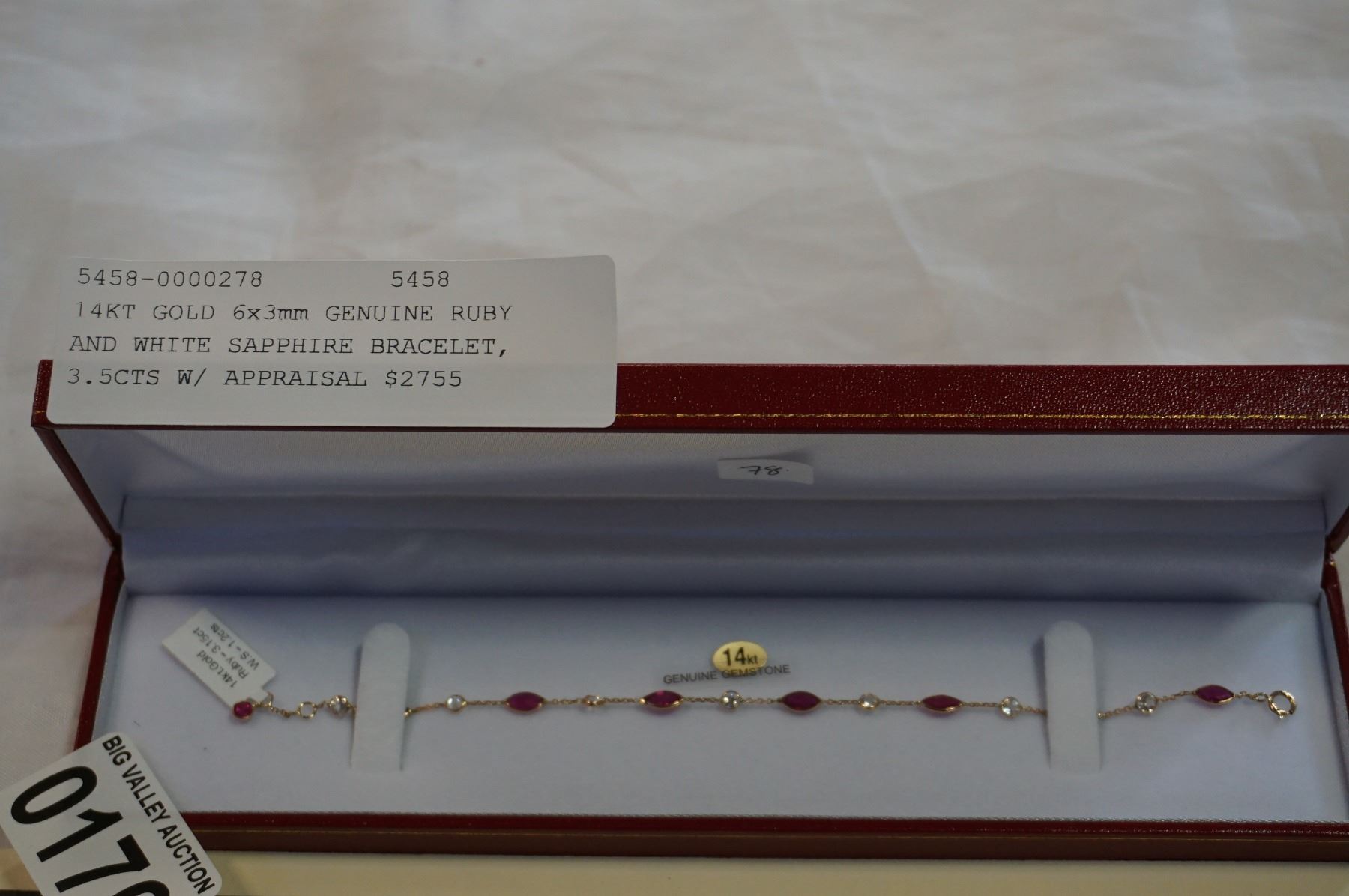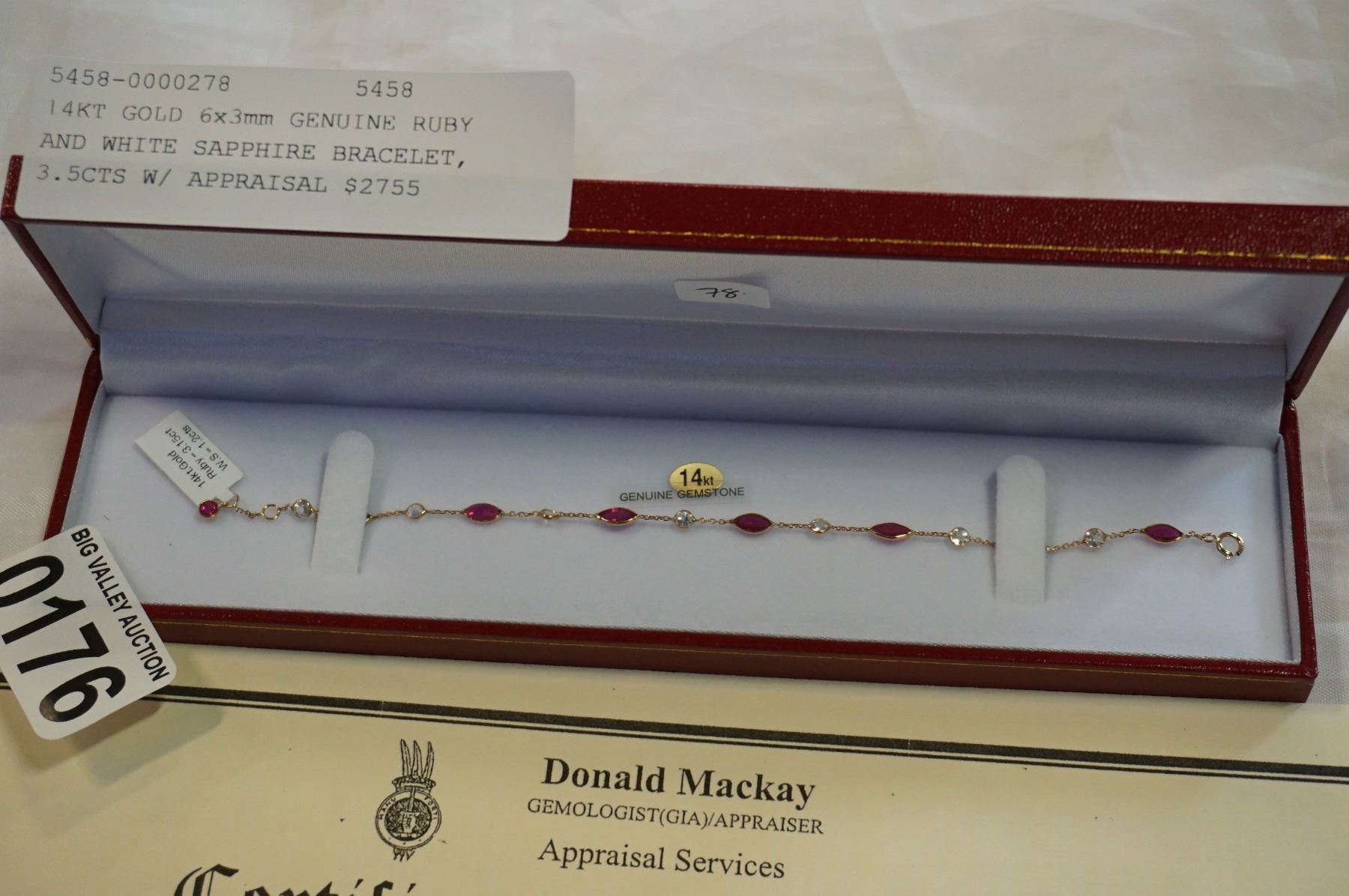 14KT GOLD 6x3mm GENUINE RUBY AND WHITE SAPPHIRE BRACELET, 3.5CTS W/ APPRAISAL $2755