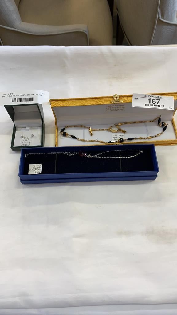 14KT GOLD PEARL EARRINGS, 18KT GOLD PLATED NECKLACE, AND VINTAGE SHERMAN NECKLACE