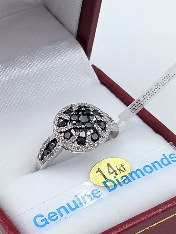 14KT WHITE GOLD GENUINE BLACK AND WHITE DIAMOND RING W/ APPRAISAL $4185 - SIZE 7, 105 DIAMOND 0.88CTS