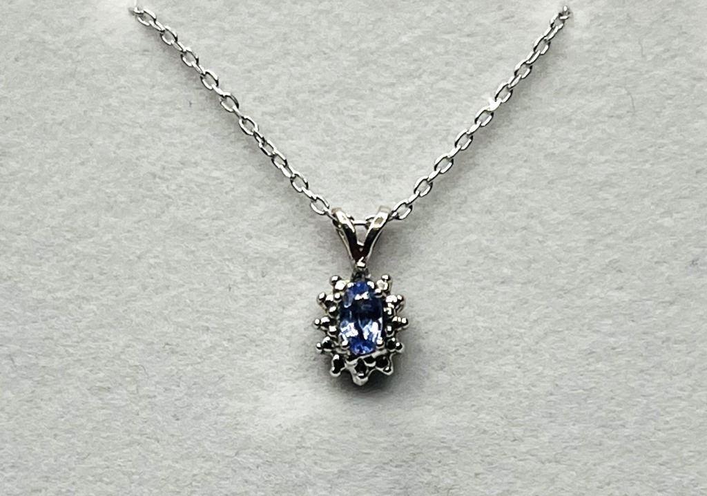 14KT WHITE GOLD NATURAL TANZANITE AND DIAMOND PENDANT WITH STERLING SILVER CHAIN, RETAIL $500.00. TANZANITE IS THE BIRTHSTONE FOR DECEMBER.