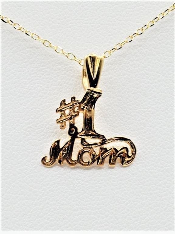 14KT. YELLOW GOLD "#1 MOM" PENDANT WITH STERLING SILVER CHAIN, RETAIL $300.00