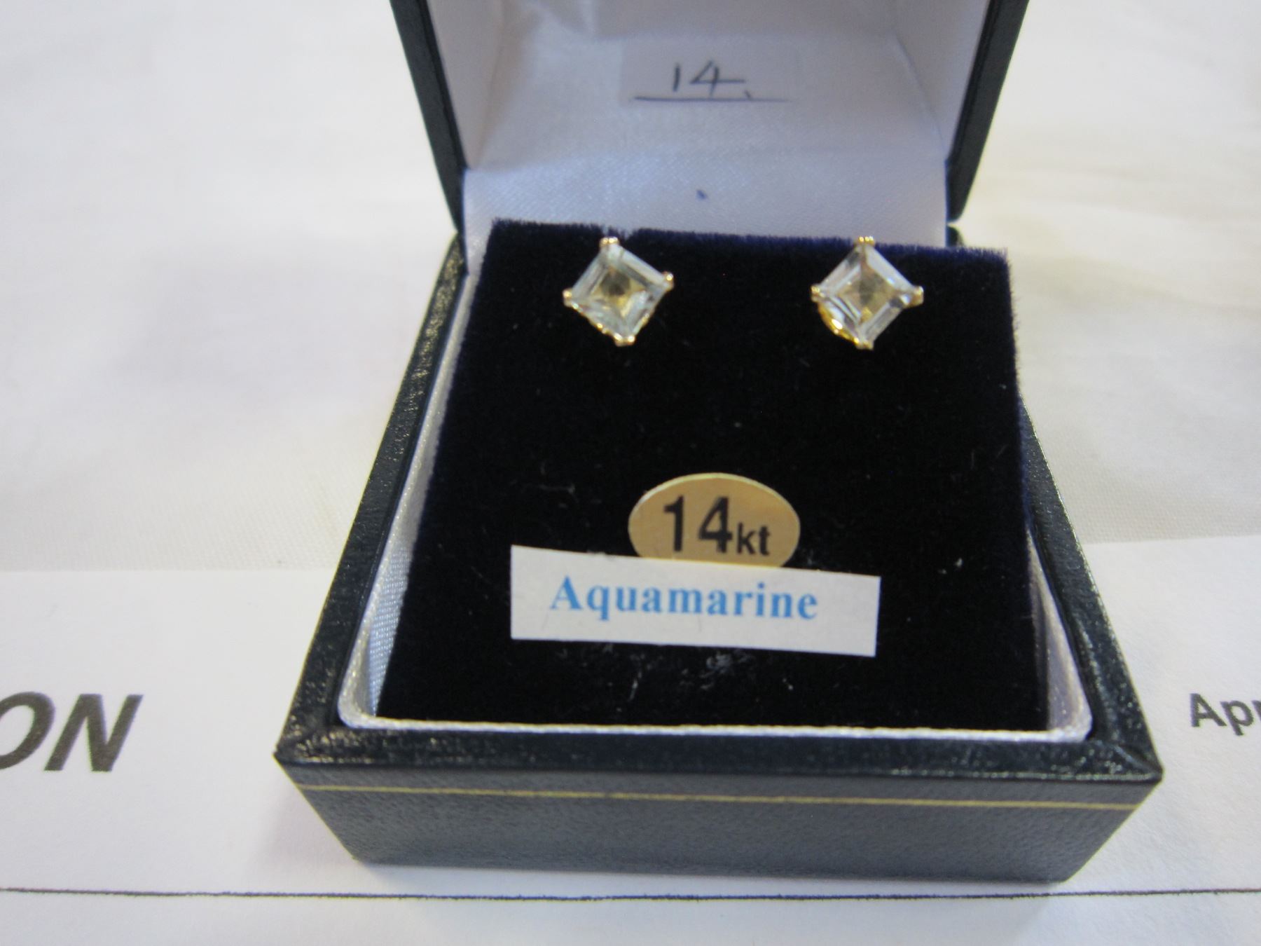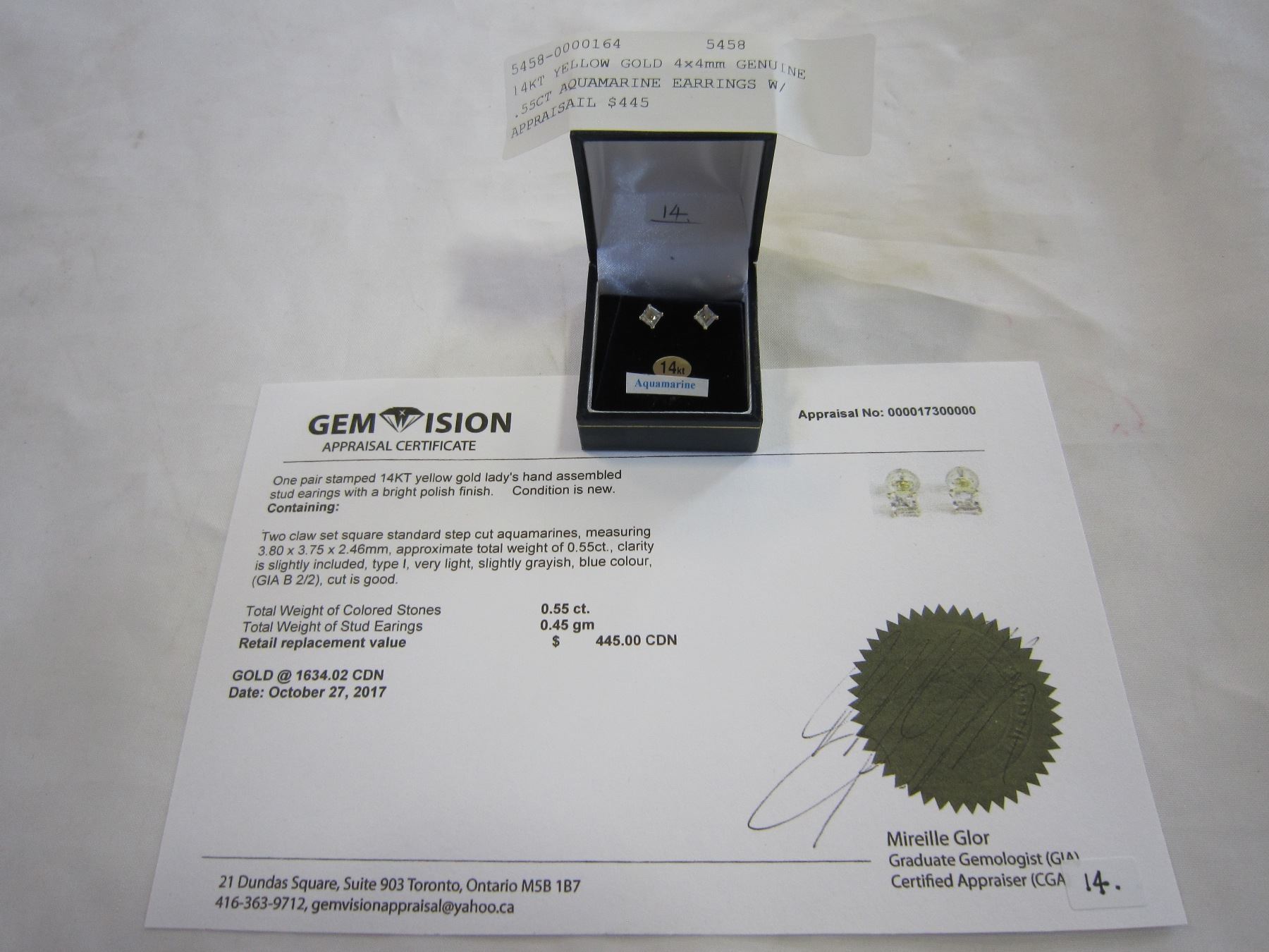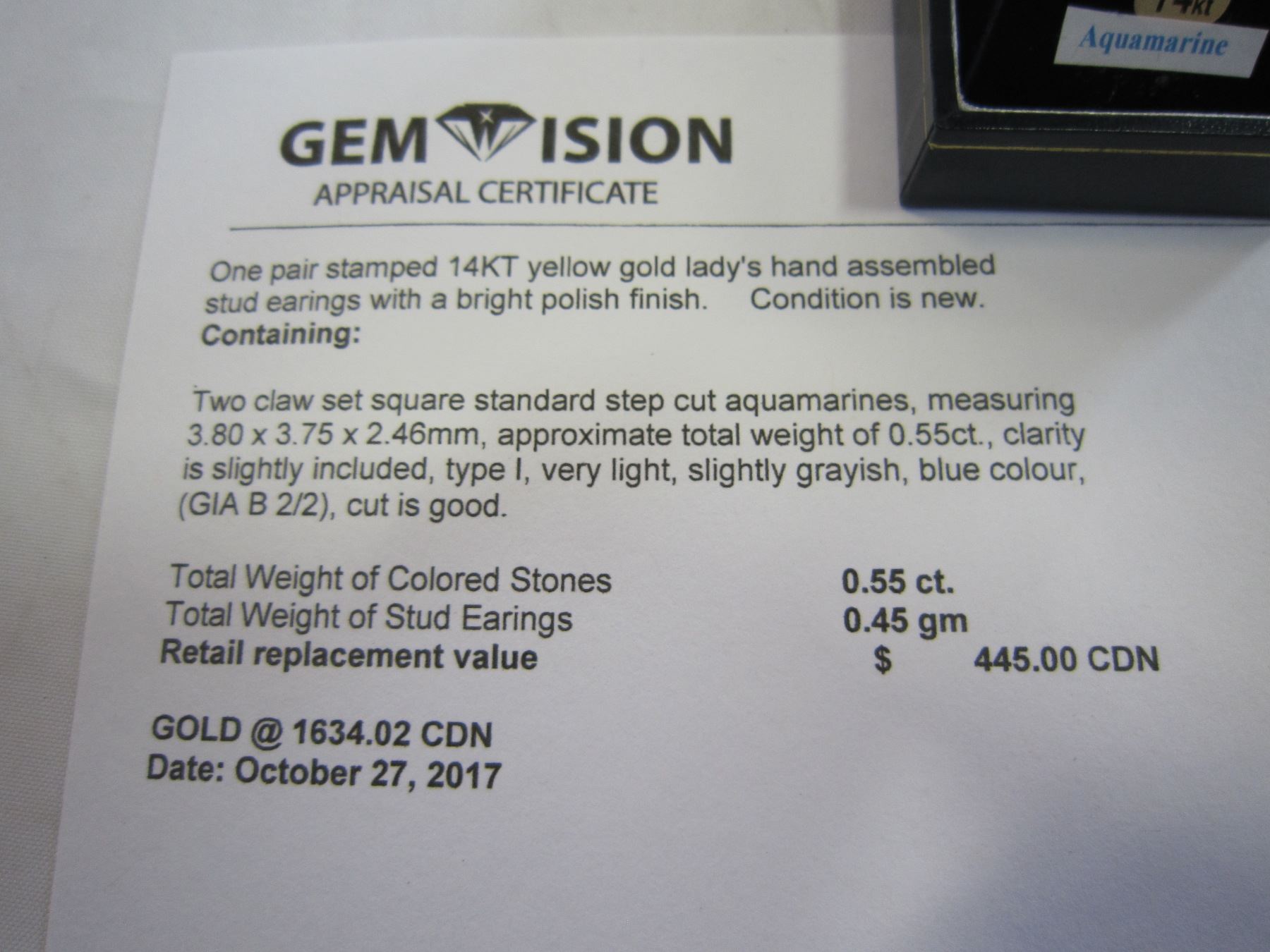 14KT YELLOW GOLD 4x4mm GENUINE .55CT AQUAMARINE EARRINGS W/ APPRAISAIL $445