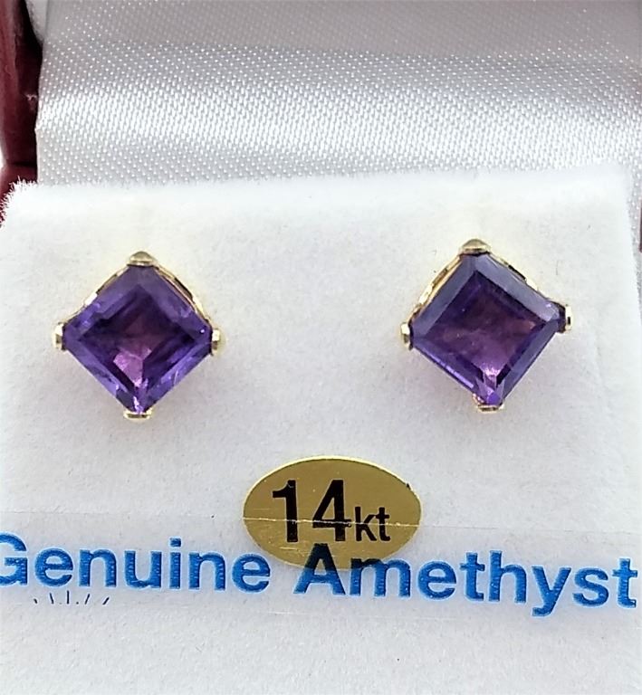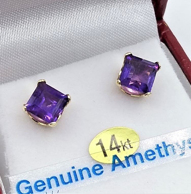 14KT YELLOW GOLD 6X6MM GENUINE AMETHYST EARRINGS - RETAIL $800