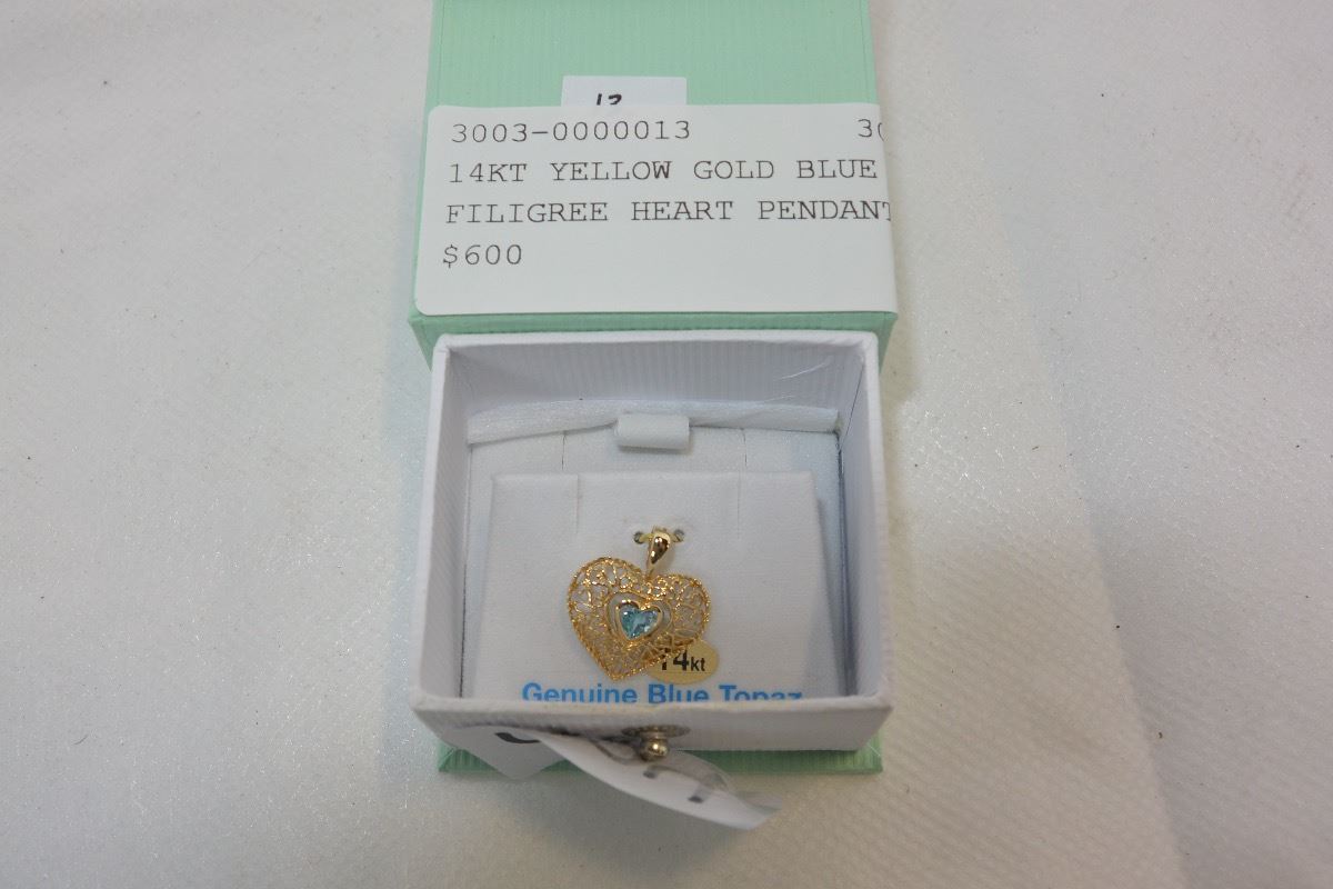 14KT YELLOW GOLD BLUE TOPAZ FILIGREE HEART PENDANT RETAIL