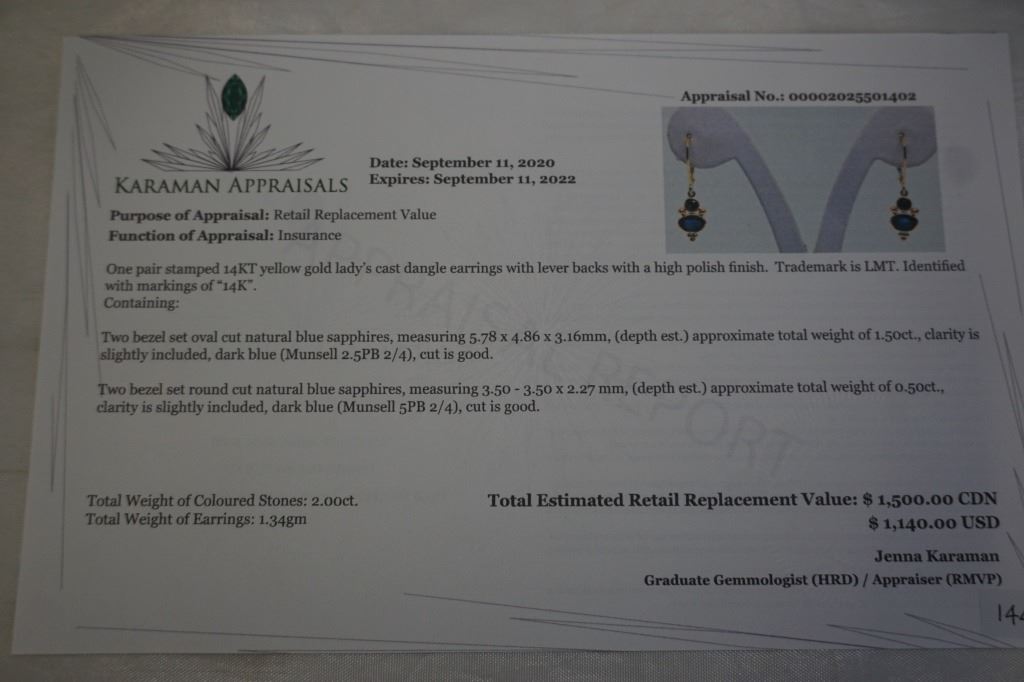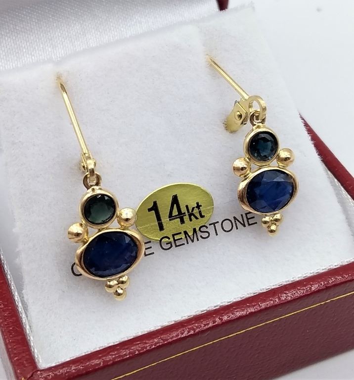 14KT YELLOW GOLD GENUINE BLUE SAPPHIRE DROP EARRINGS W/ APPRAISAL $1500 - 4 SAPPHIRE (2CTS)