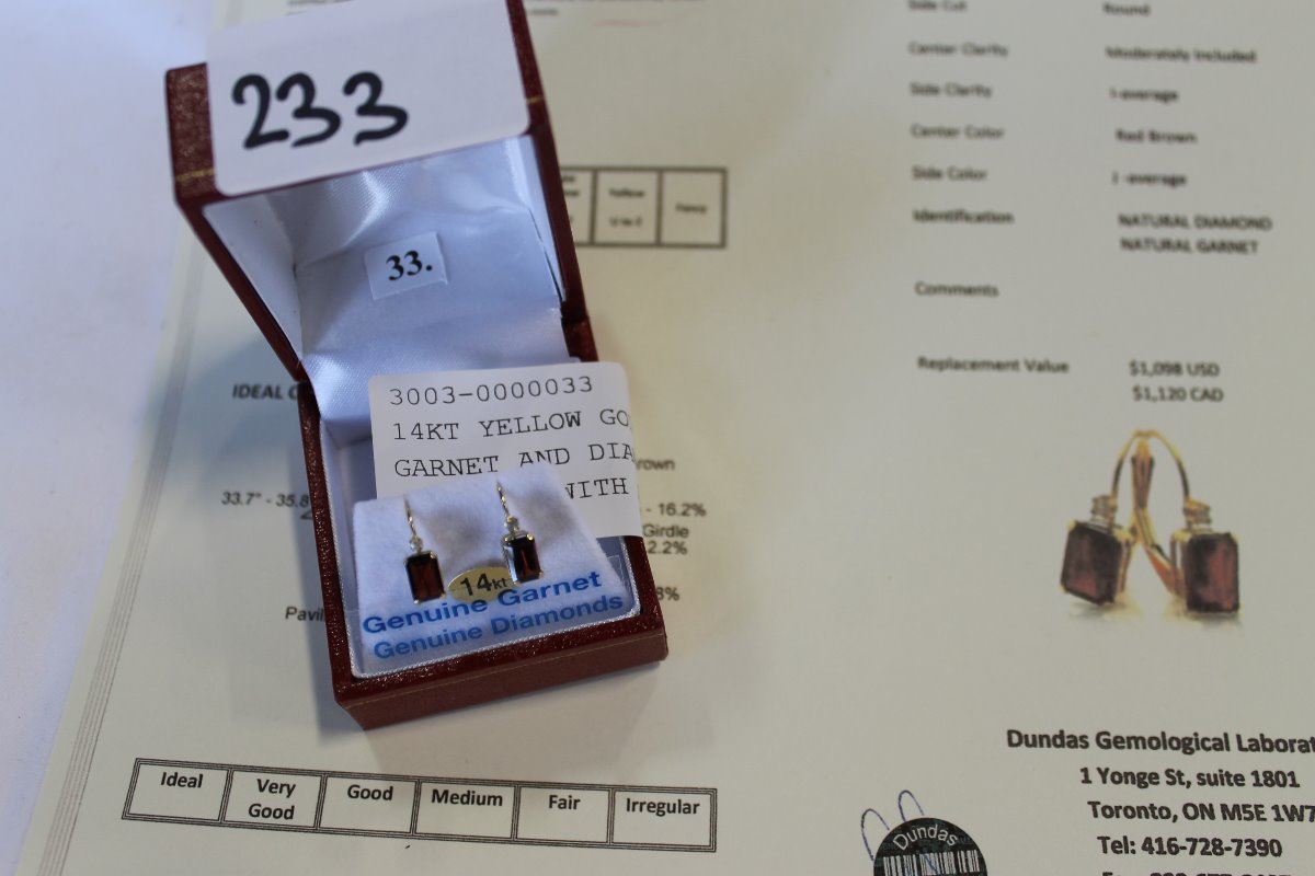 14KT YELLOW GOLD GENUINE GARNET AND DIAMOND LEVERBACK