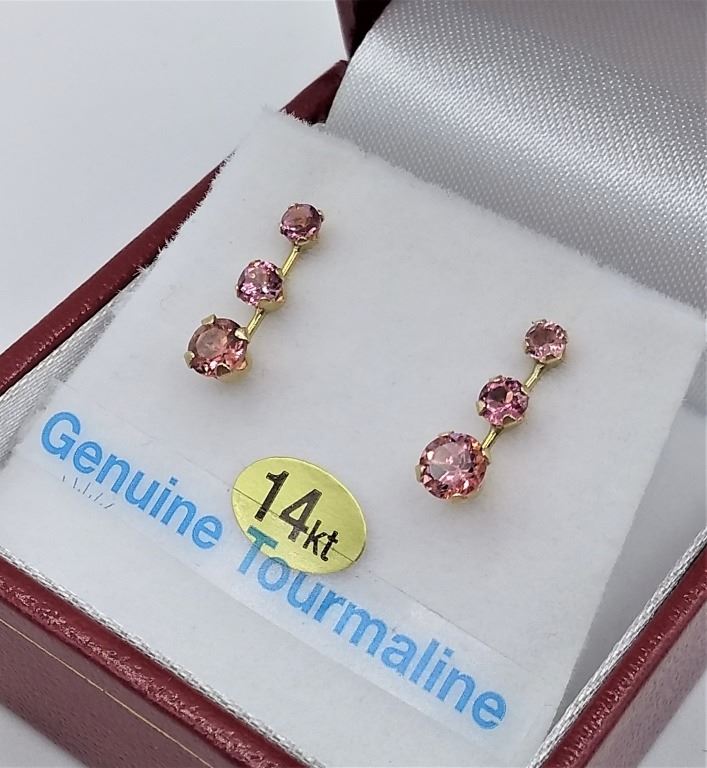 14KT YELLOW GOLD GENUINE PINK TOURMALINE EARRINGS - RETAIL $500, 1.2CTS TOURMALINE BIRTHSTONE OCTOBER