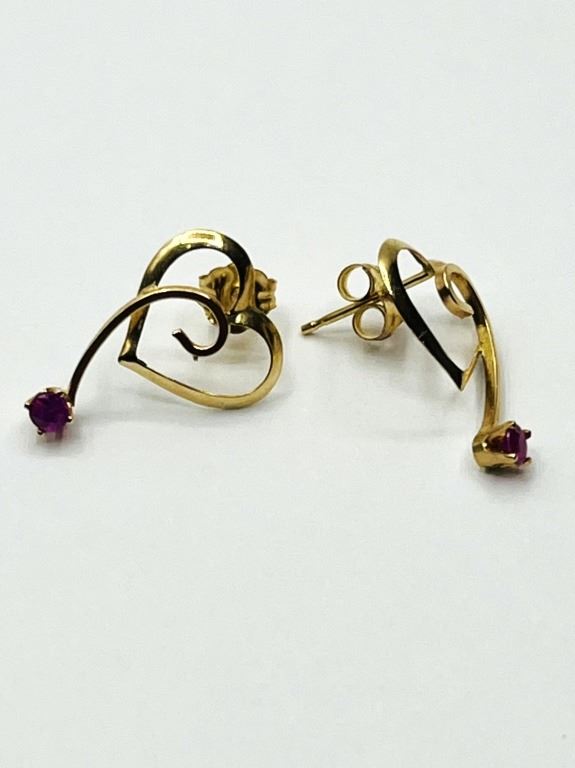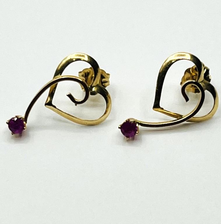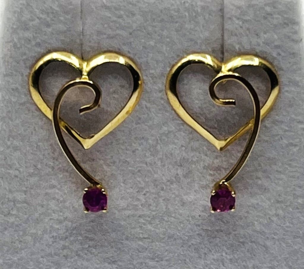 14KT YELLOW GOLD NATURAL ENHANED RUBY HEART SHAPE EARRING, RETAIL $400.00. RUBY IS THE BIRTHSTONE FOR JULY.