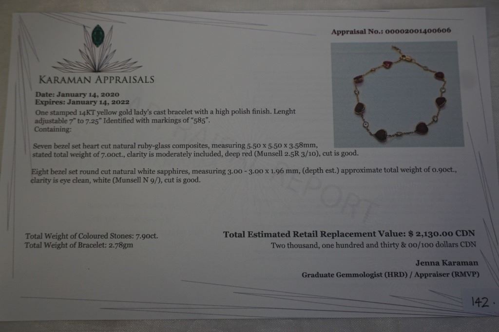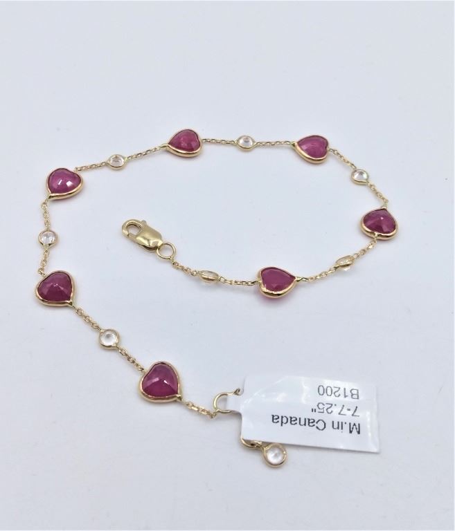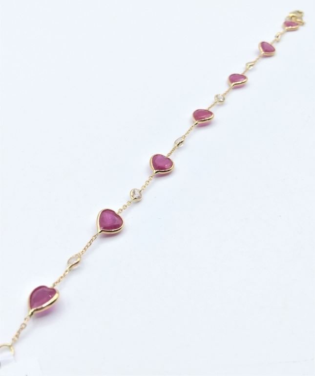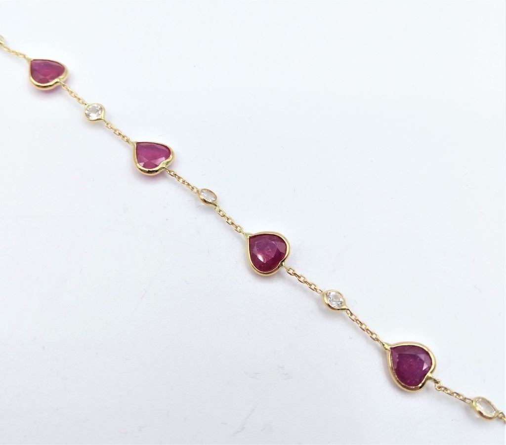 14KT YELLOW GOLD NATURAL RUBY AND WHITE SAPPHIRE HEART BRACELET W/ APPRAISAL $2130 - 7CTS RUBY
