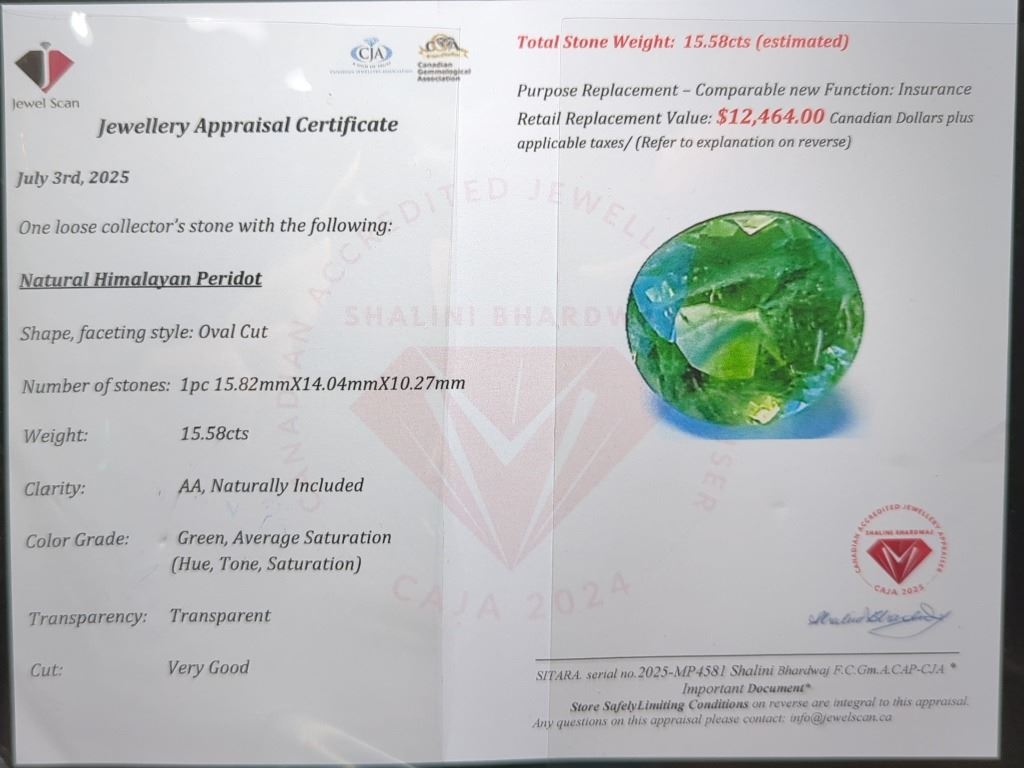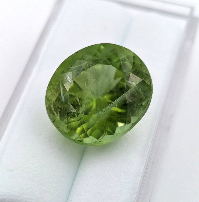 15.58 CT AUTHENTICATED PERIDOT GEMSTONE ($12,464 APPRAISAL)