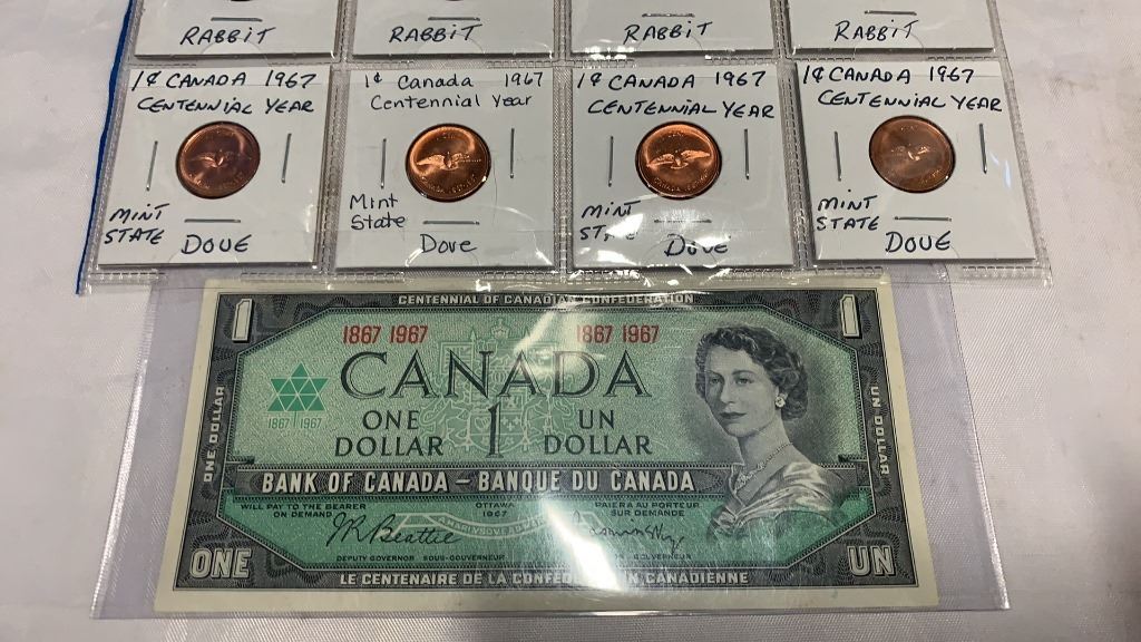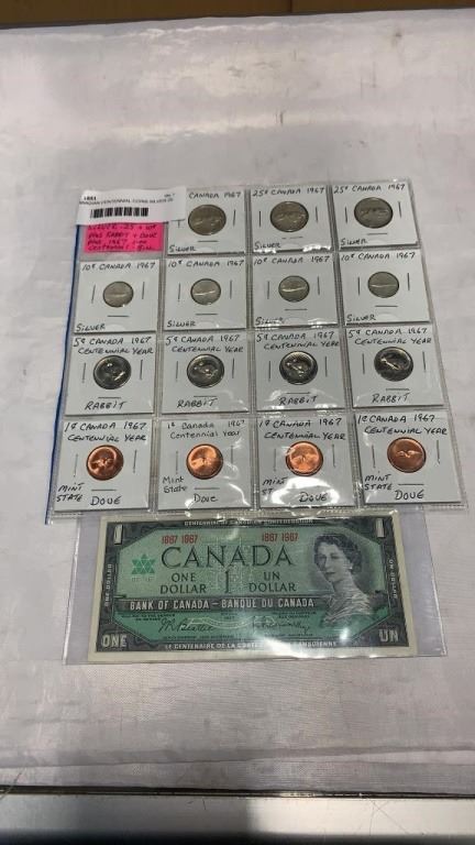 15 CANADIAN CENTENNIAL COINS SILVER 25 CENT, 10 CENT, RABBIT 5 CENT, DOVE 1 CENT, AND 1867/1967 1 DOLLAR BILL