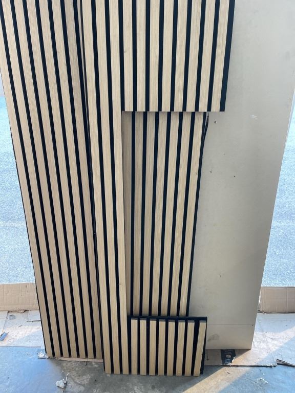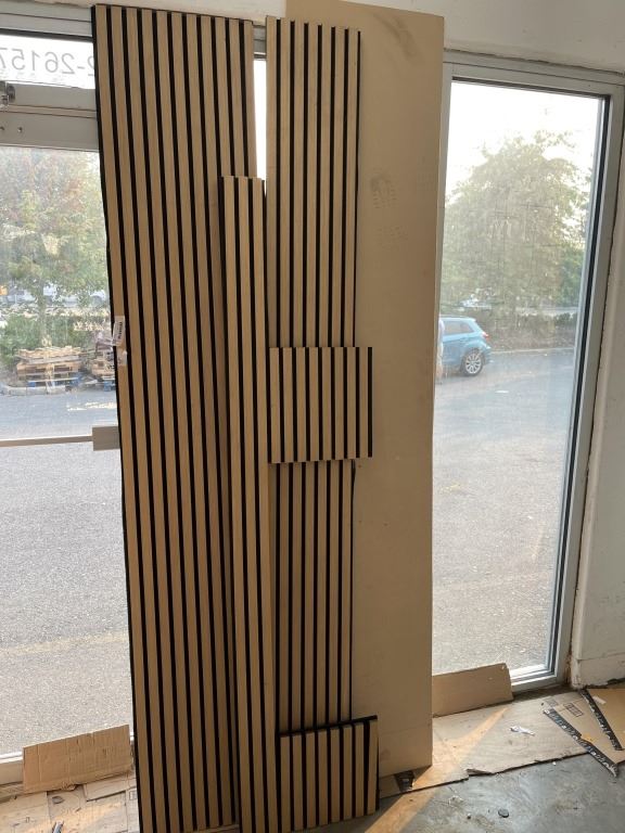 16 INCH X 8FT 1/2 MDF BOARD, AND 3 CUT PIECES OF ACCOUSTICAL PANELLING