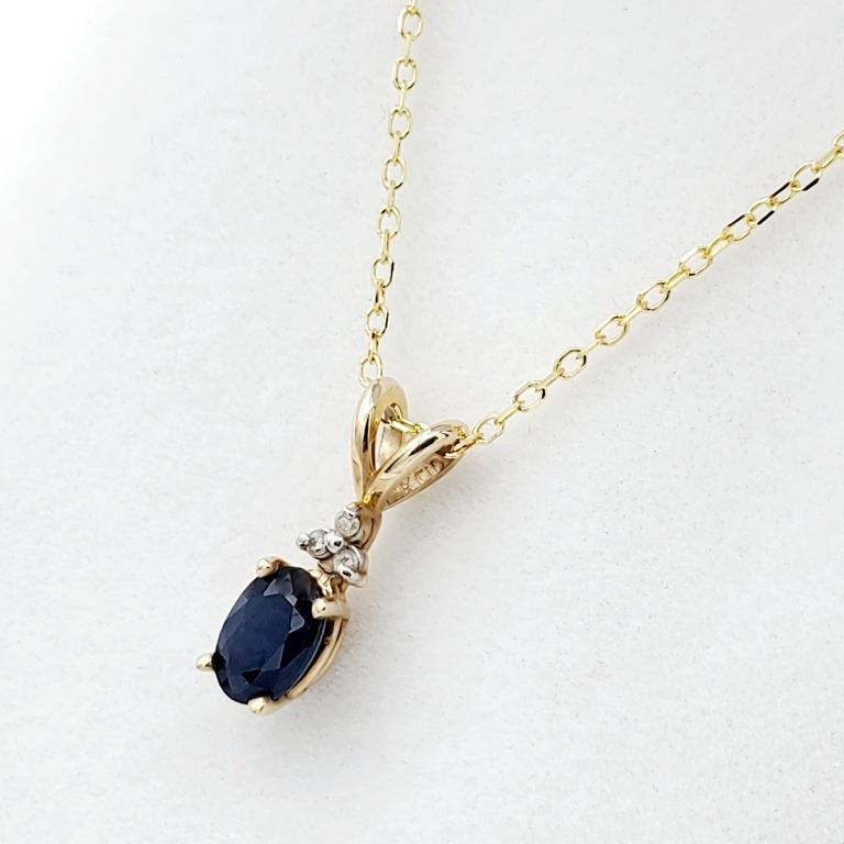 NEW 10KT YELLOW GOLD GENUINE BLUE SAPPHIRE AND DIAMOND PENDANT W/ YELLOW GOLD PLATED STERLING CHAIN W/ APPRAISAL $1000