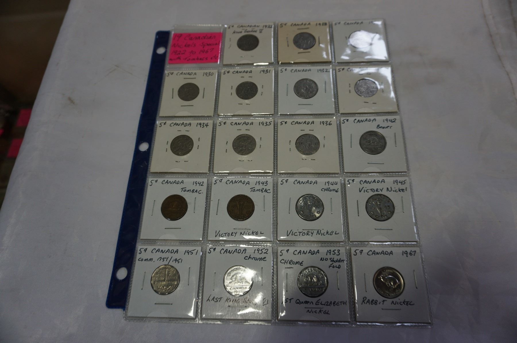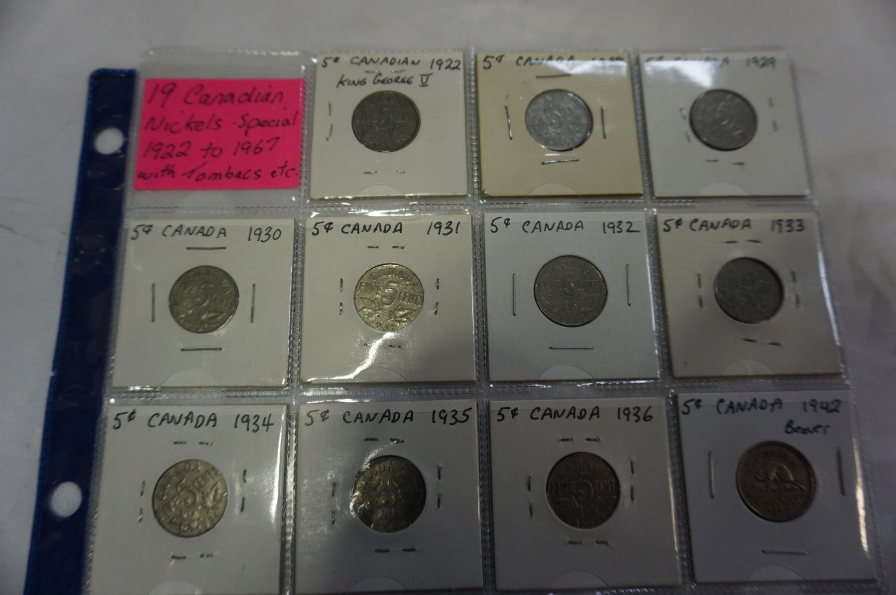 19 CANADIAN NICKELS 1922-1967 WITH KING GEORGE V, KING GEORGE VI, QUEEN ELIZABETH II WITH TOMBACS