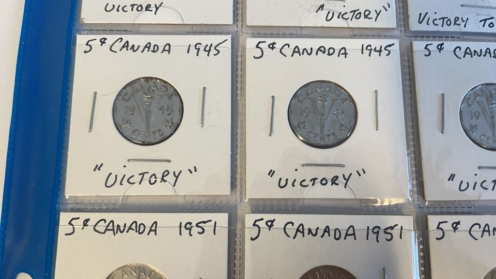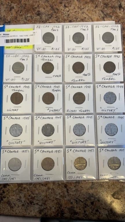 19 CANADIAN NICKELS - 1942 TYPE 1 AND 2 TOMBAC, 1943 TOMBAC VICTORY, 1944 AND 1945 VICTORY, 1951 (19