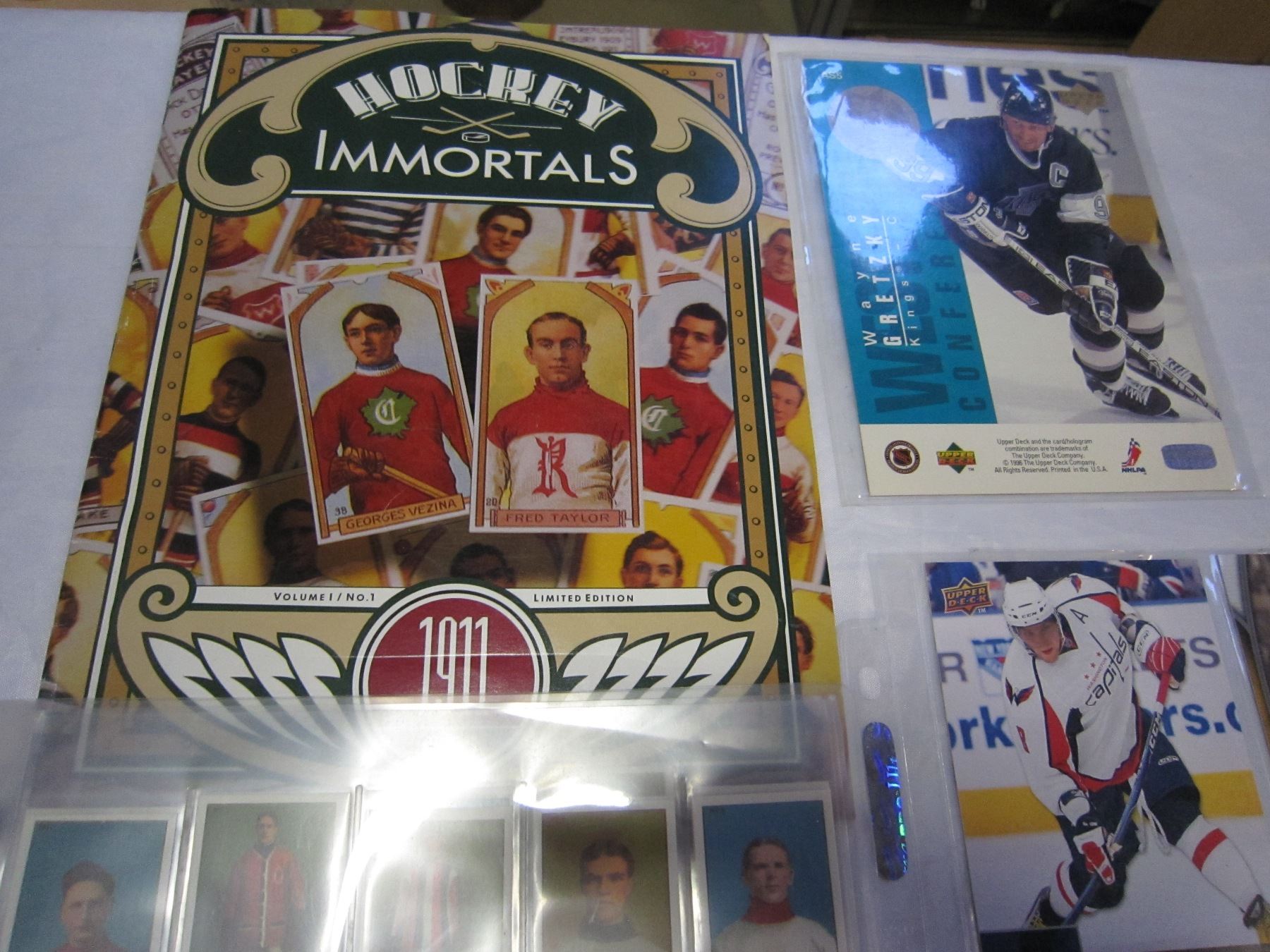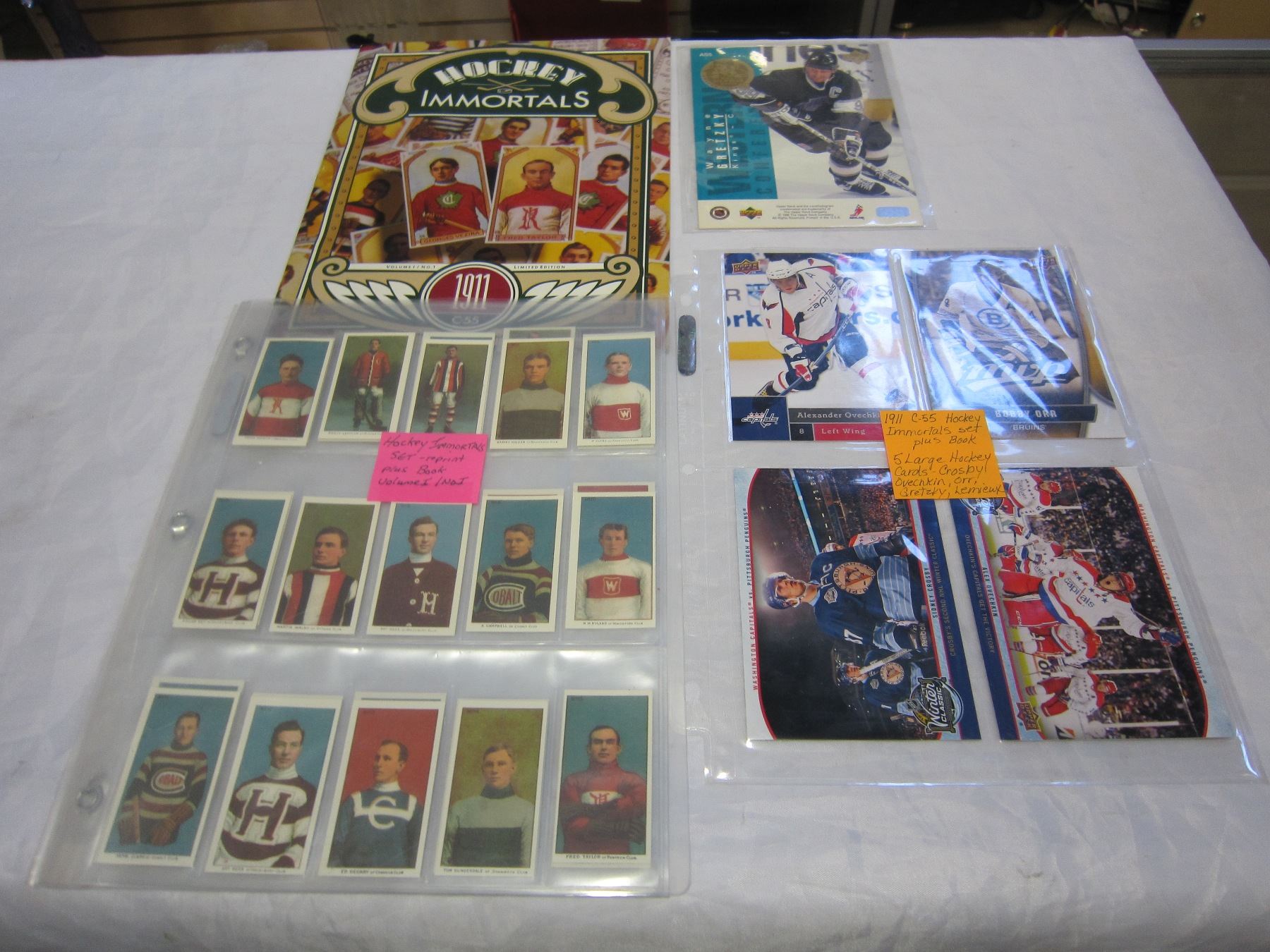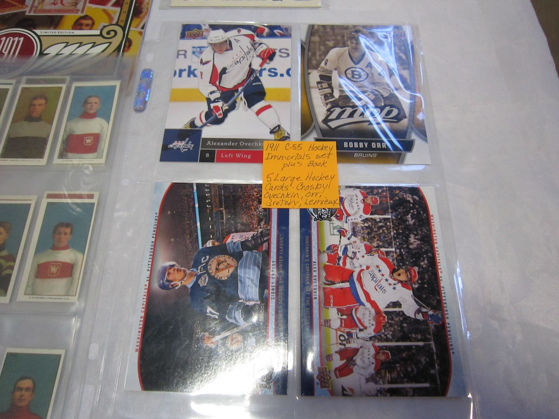 1911 C-55 HOCKEY IMMORTAL REPRINT SET PLUS BOOK AND 5 LARGE HOCKEY CARDS, CROSBY, OVECHKIN, ORR, GRETZKY, LEMIEUX