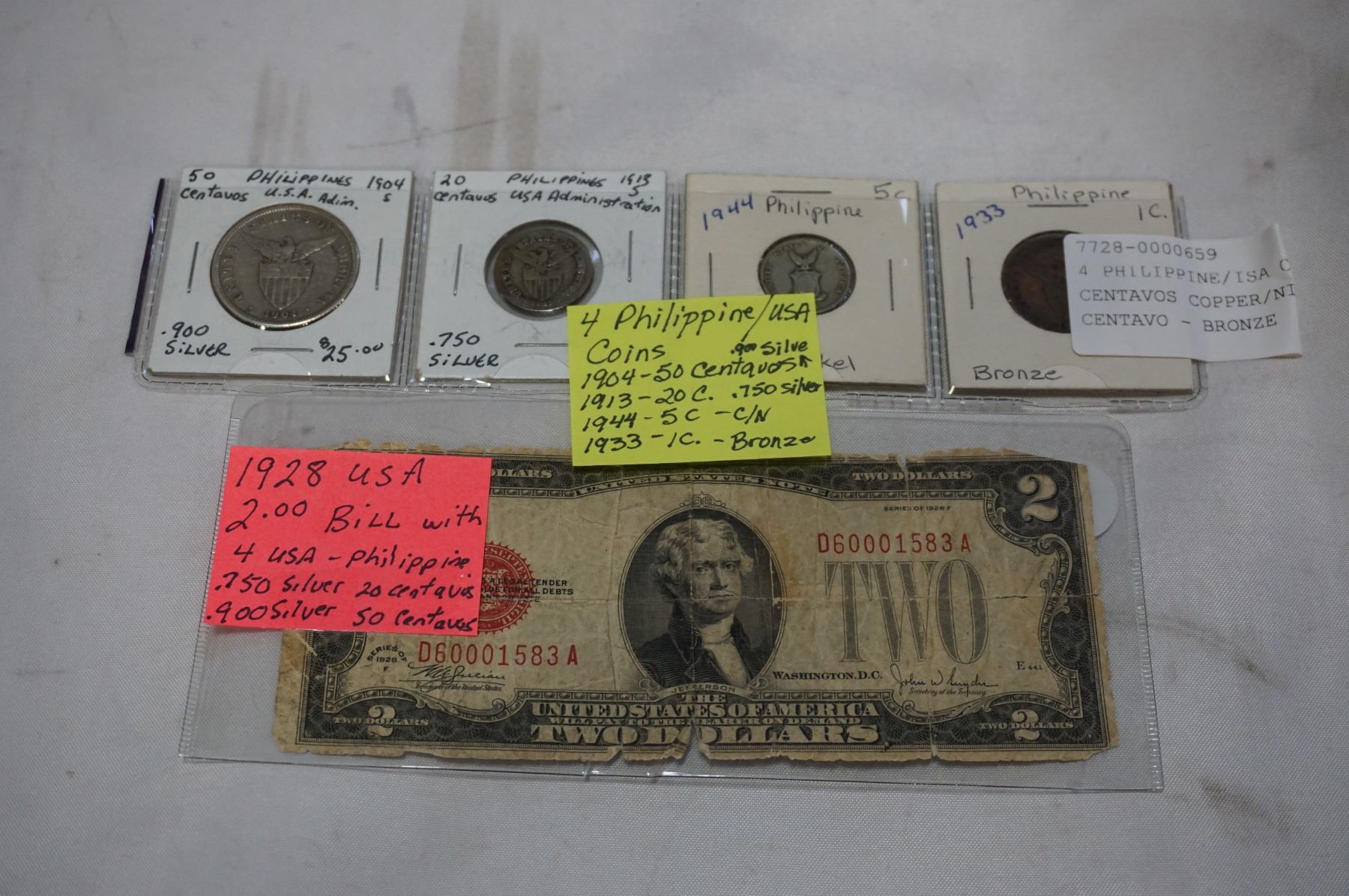 1920 USA $2 BILL RED SEAL, WITH .900 SILVER 50 CENTAVAS, .750 SILVER 20 CENTAVAS AND FIVE 1 CENTAVAS COINS