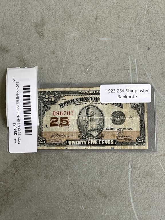 1923 25 CENT SHINPLASTER BANK NOTE