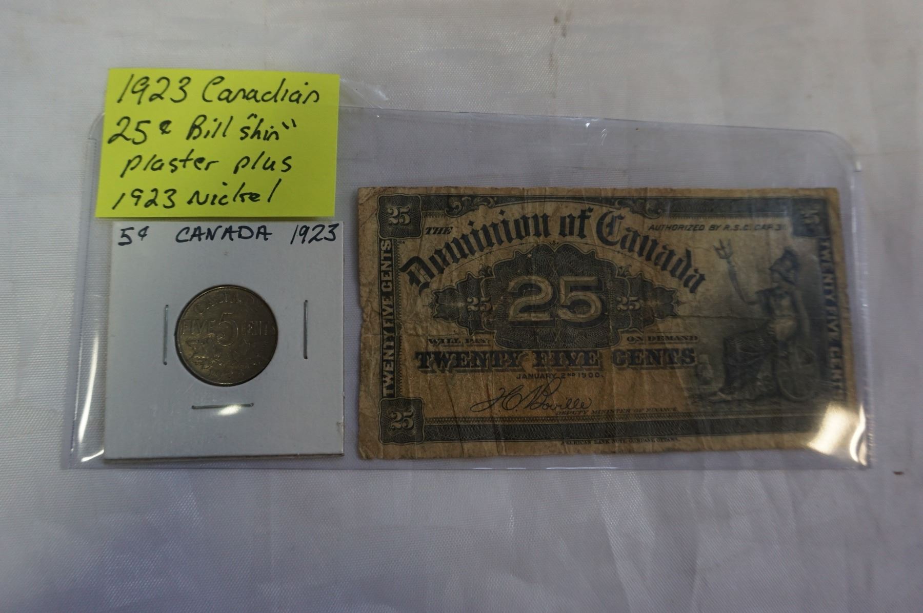 1923 CANADIAN 25c BILL SHIN PLASTER PLUS 1923 NICKEL