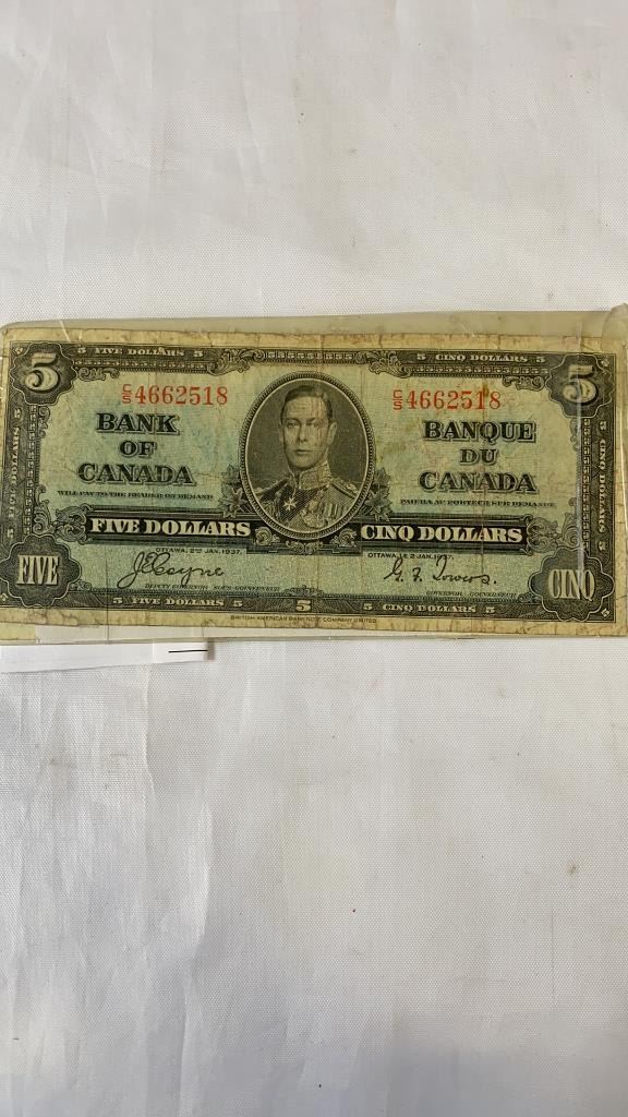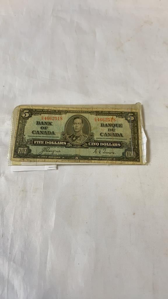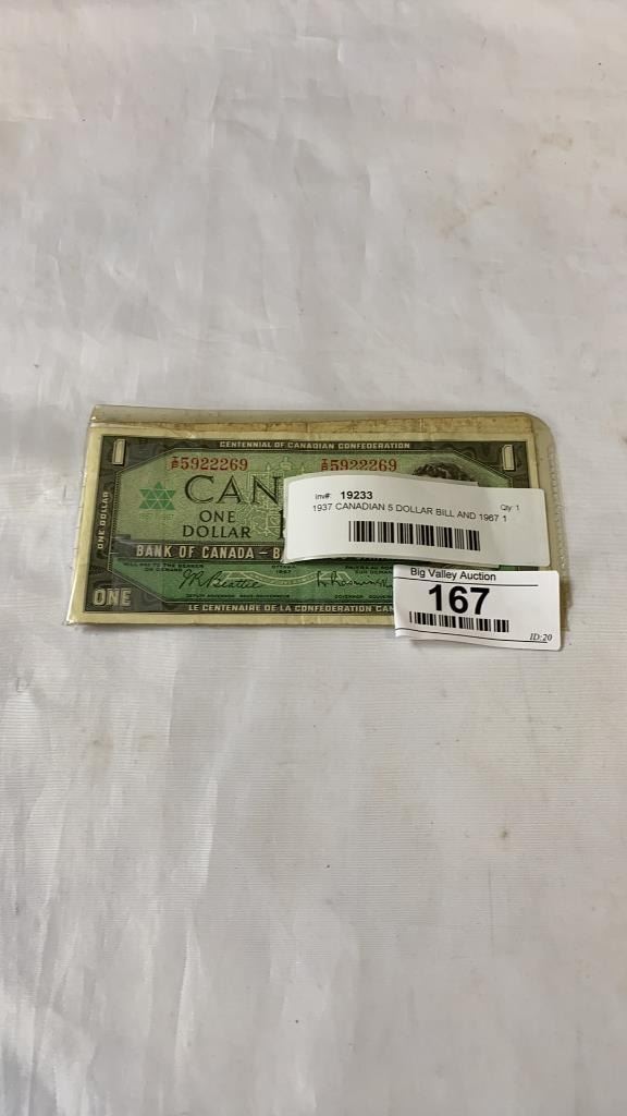 1937 CANADIAN 5 DOLLAR BILL AND 1967 1 DOLLAR BILL