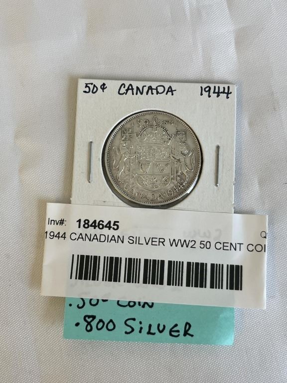 1944 CANADIAN SILVER WW2 50 CENT COIN .800 SILVER